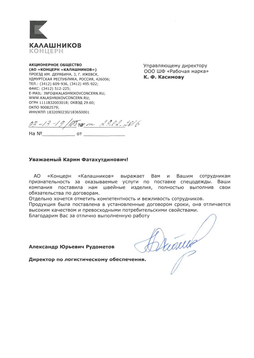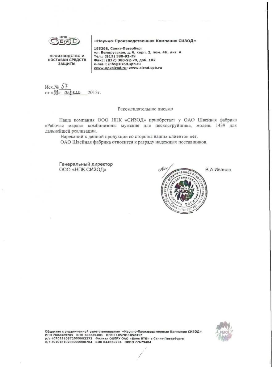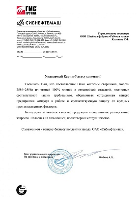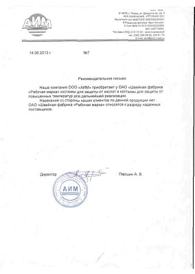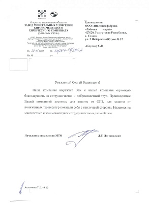 ООО Швейная фабрика «Рабочая марка» сотрудничает с предприятиями разных отраслей промышленности, поэтому вся продукция разрабатывается с учетом условий труда на предприятии заказчика. Спецодежда нашей фабрики проходит обязательную проверку на соответствие требованиям ТР ТС 019/2011 в аккредитованных сертификационных центрах. Именно поэтому наши клиенты всегда получают продукцию в полном соответствии с заданными характеристиками. Многолетний опыт работы и ответственное отношение сотрудников к своему делу, позволяют ООО Швейная фабрика «Рабочая марка» изготовить, а нашим клиентам приобрести качественную спецодежду для любых условий труда.