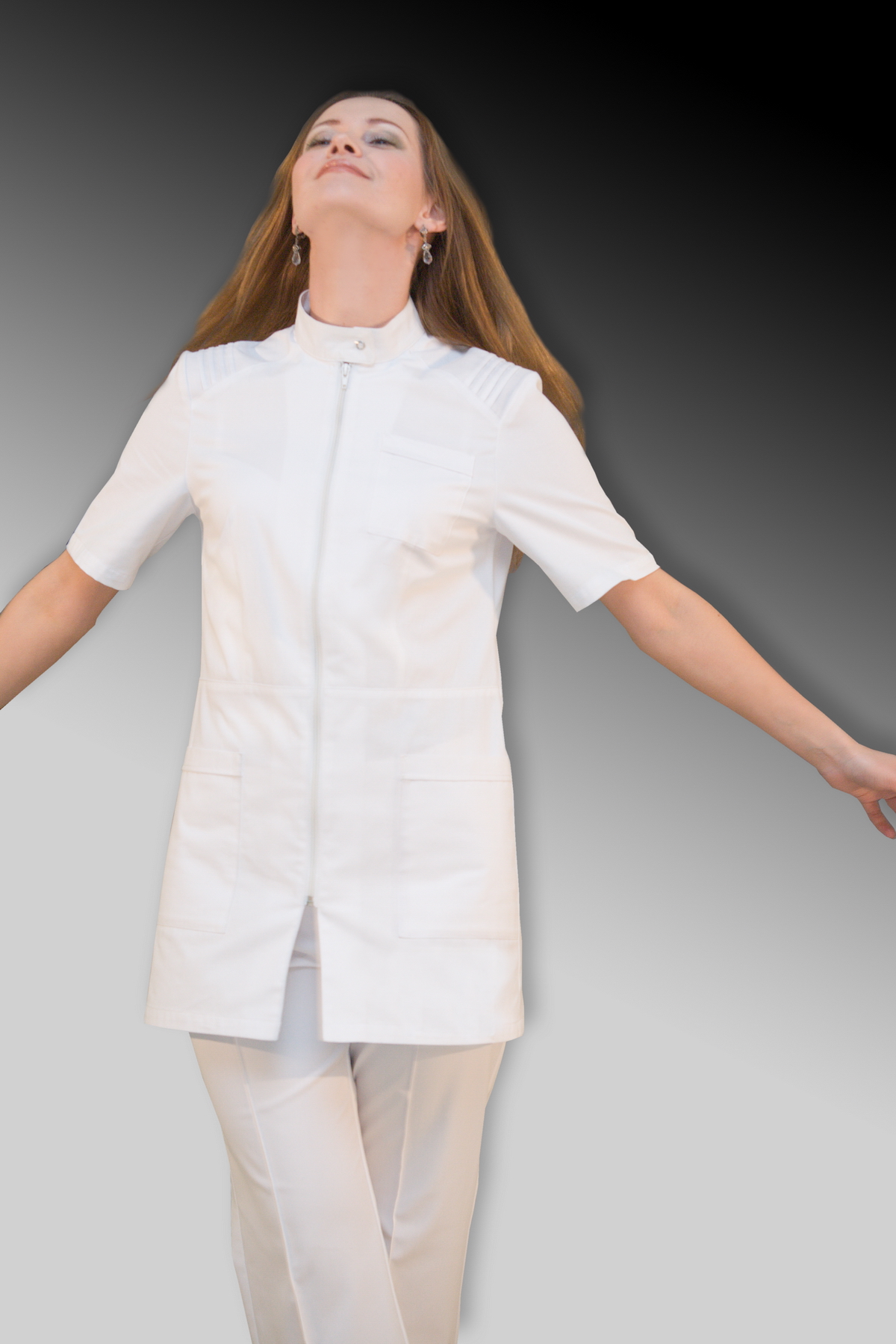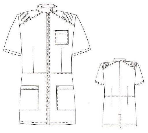 - Плечи украшены декоративными «защипами», глухой ворот на кнопке защищает от попадания вредных жидкостей на тело.