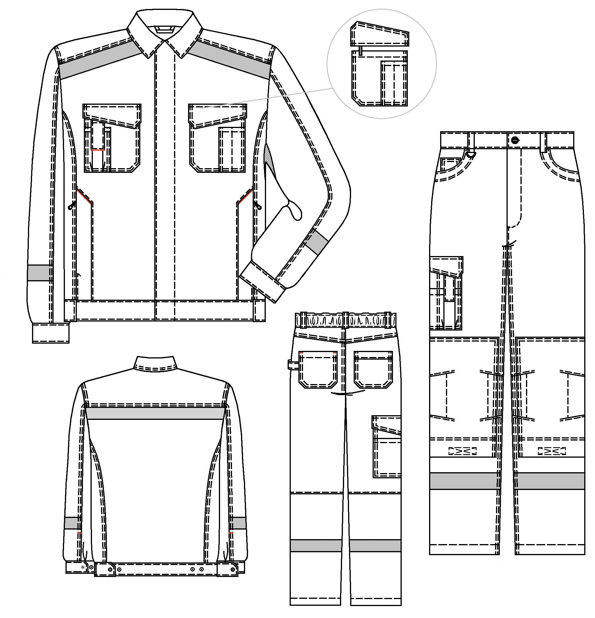 Задние половинки с кокетками, накладными карманами.