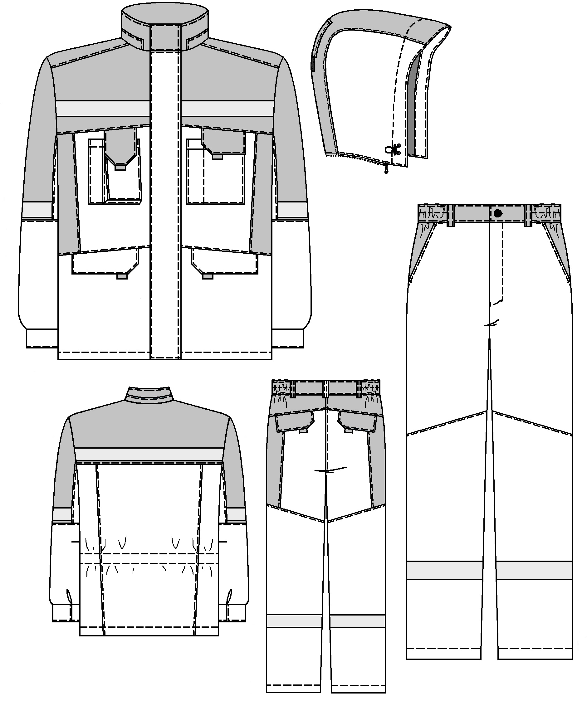 Передние половинки с боковыми карманами с отрезным бочком и наколенниками.