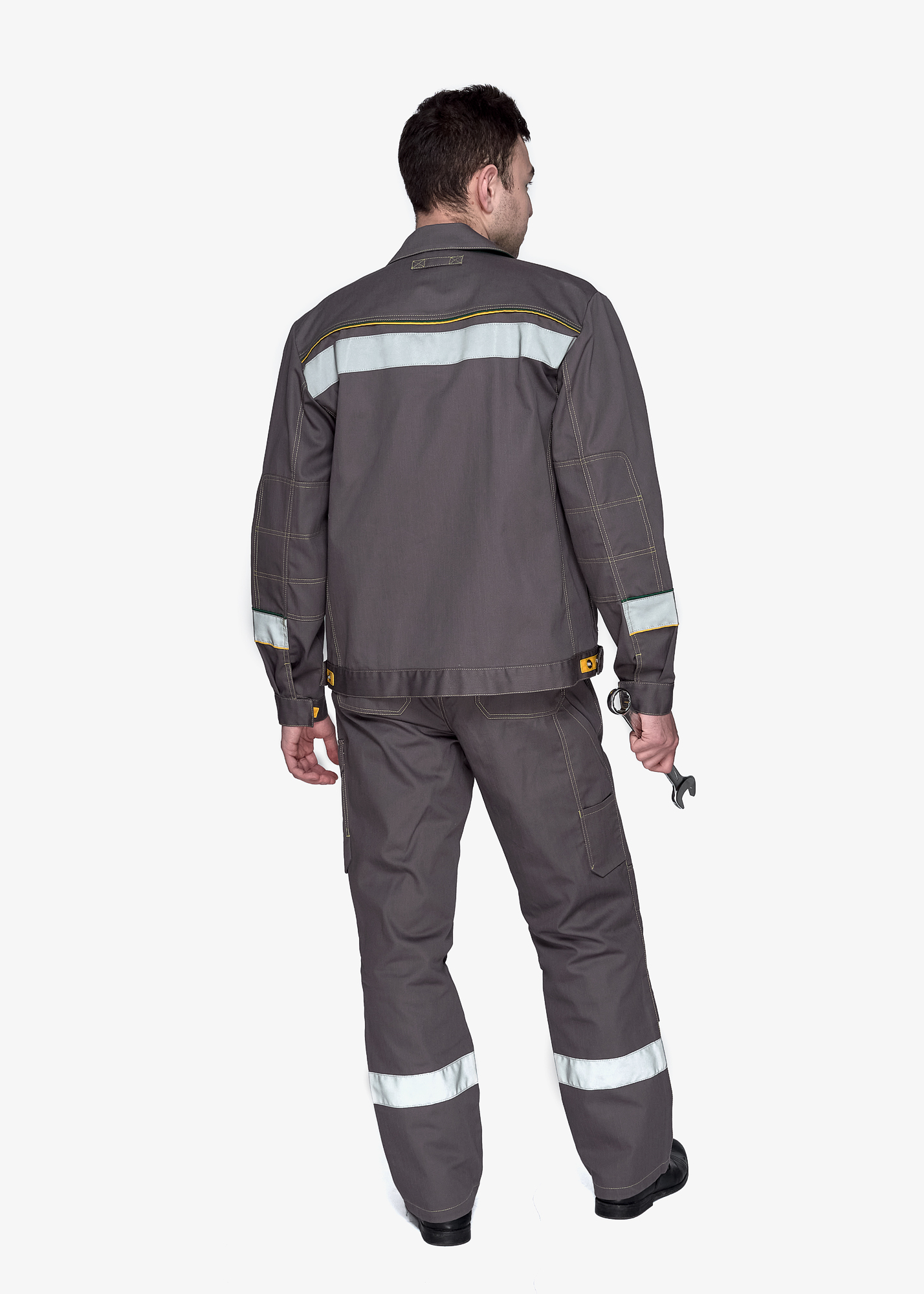 Полочки с кокетками, рельефными швами, многофункциональными левым нагрудным накладным карманом и боковыми накладными карманами, правым карманом для пропуска.