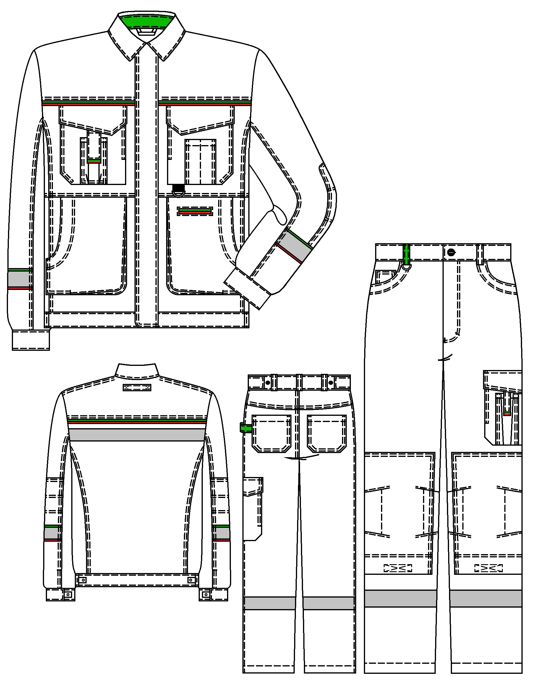 Полочки с кокетками, рельефными швами, многофункциональными нагрудными накладными карманами с клапанами, боковыми карманами.