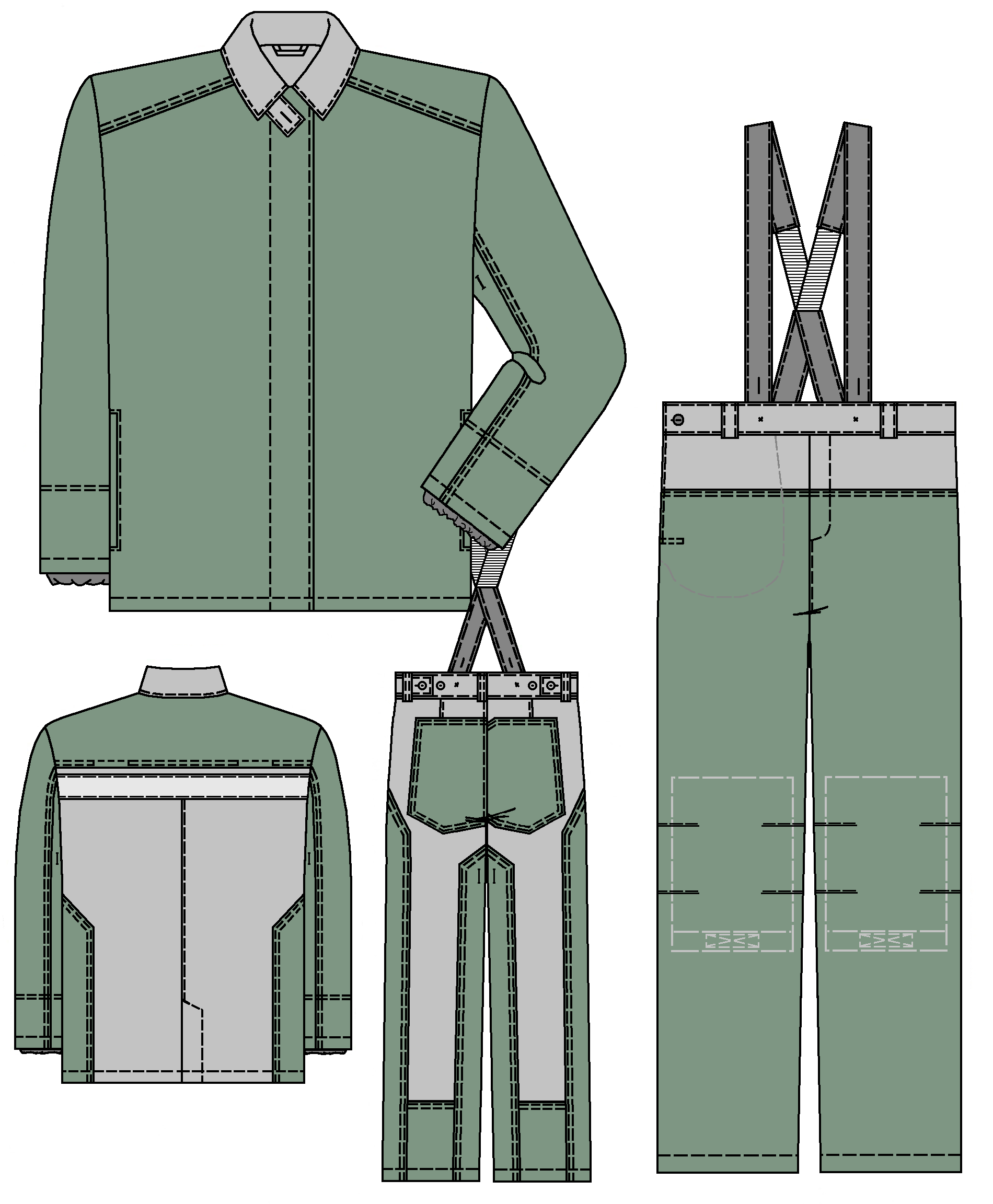 Задние половинки с талевыми вытачками, с накладками в области сидения, вдоль боковых, шаговых швов и по низу.