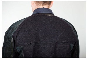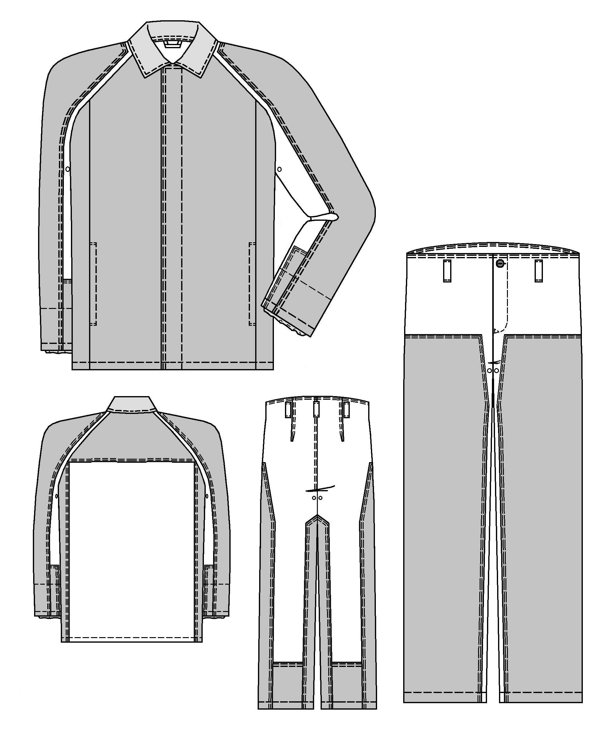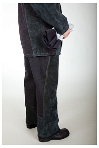 Задние половинка с накладками по низу и вдоль шаговых швов. Вверху шаговых швов на передних и задних половинках расположены вентиляционные отверстия в виде люверсов.