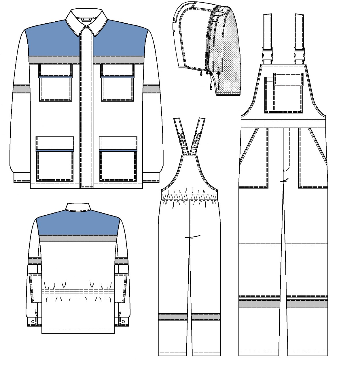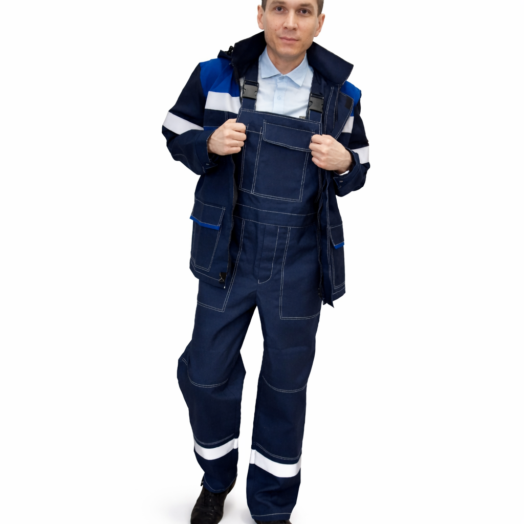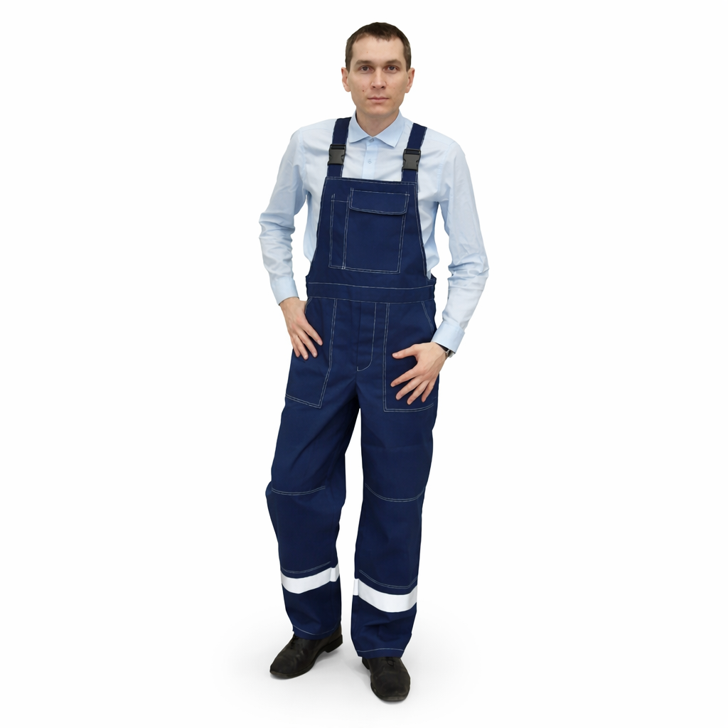 По швам притачивания кокеток полочек и спинки, на рукавах выше локтя, на передних и задних половинках полукомбинезона ниже колена располагается полоса световозвращающего материала шириной 50мм.