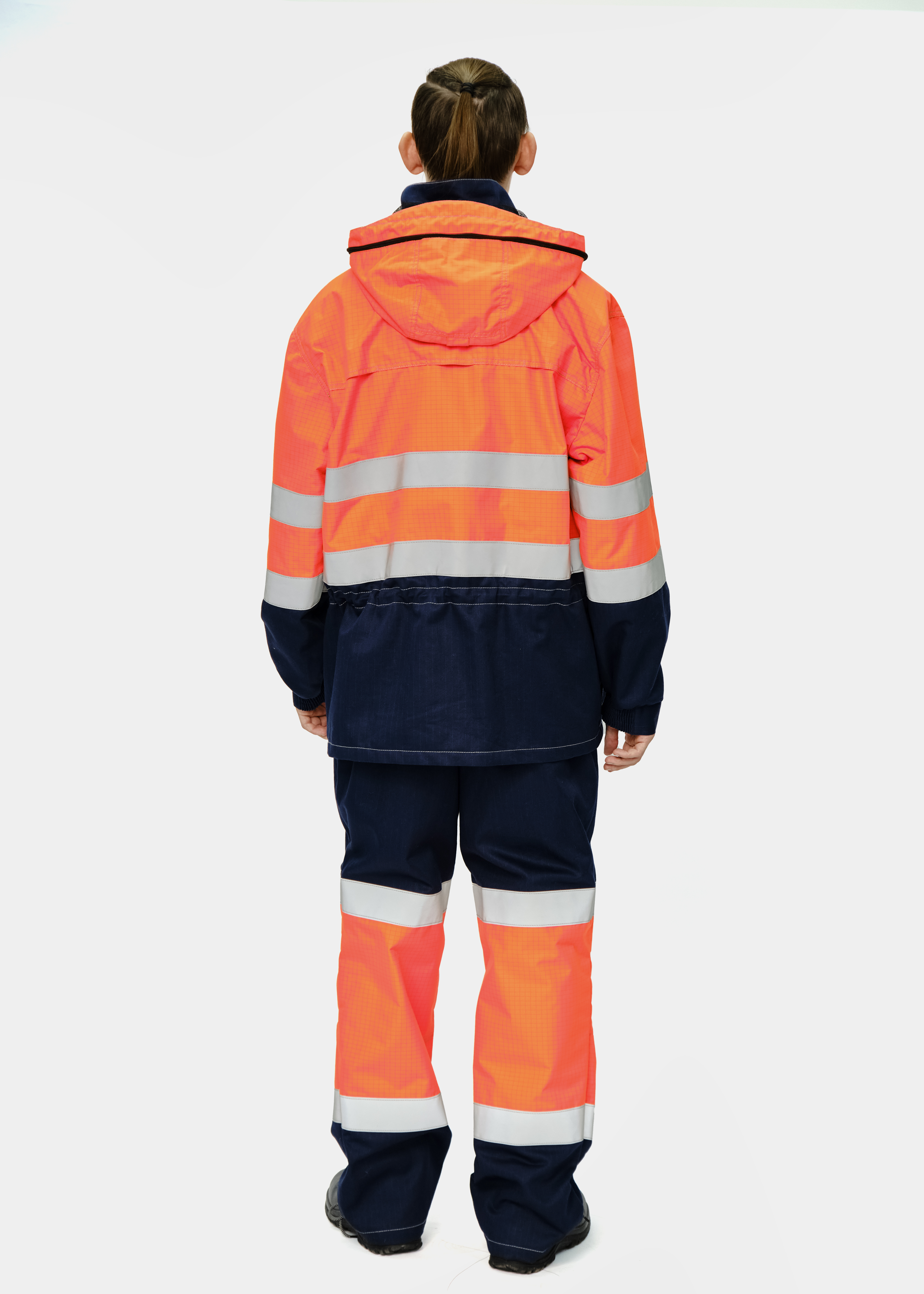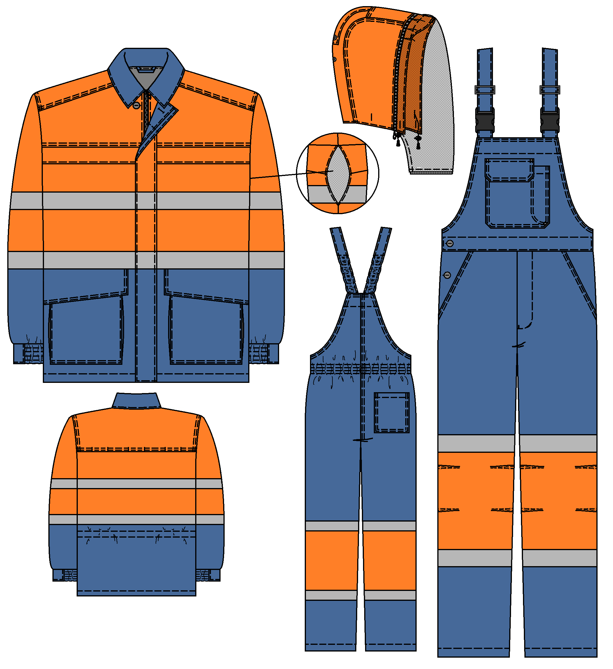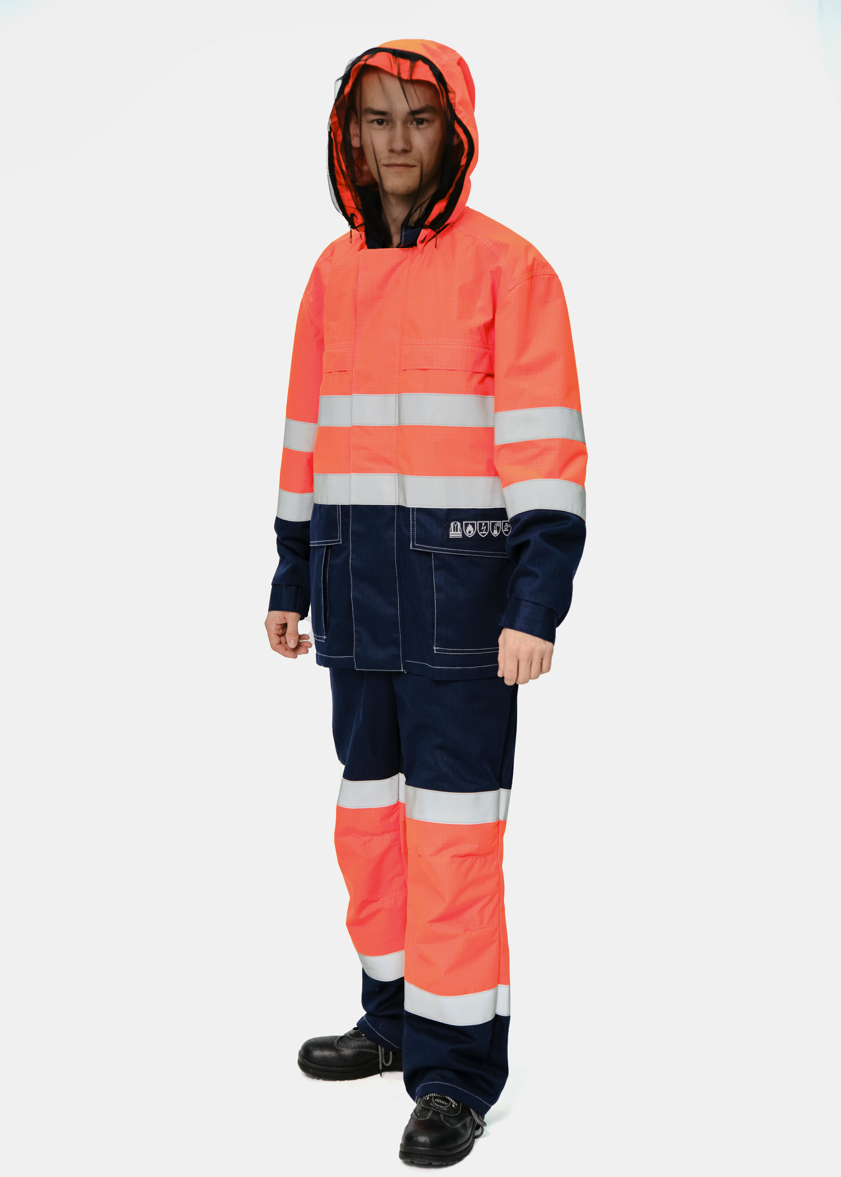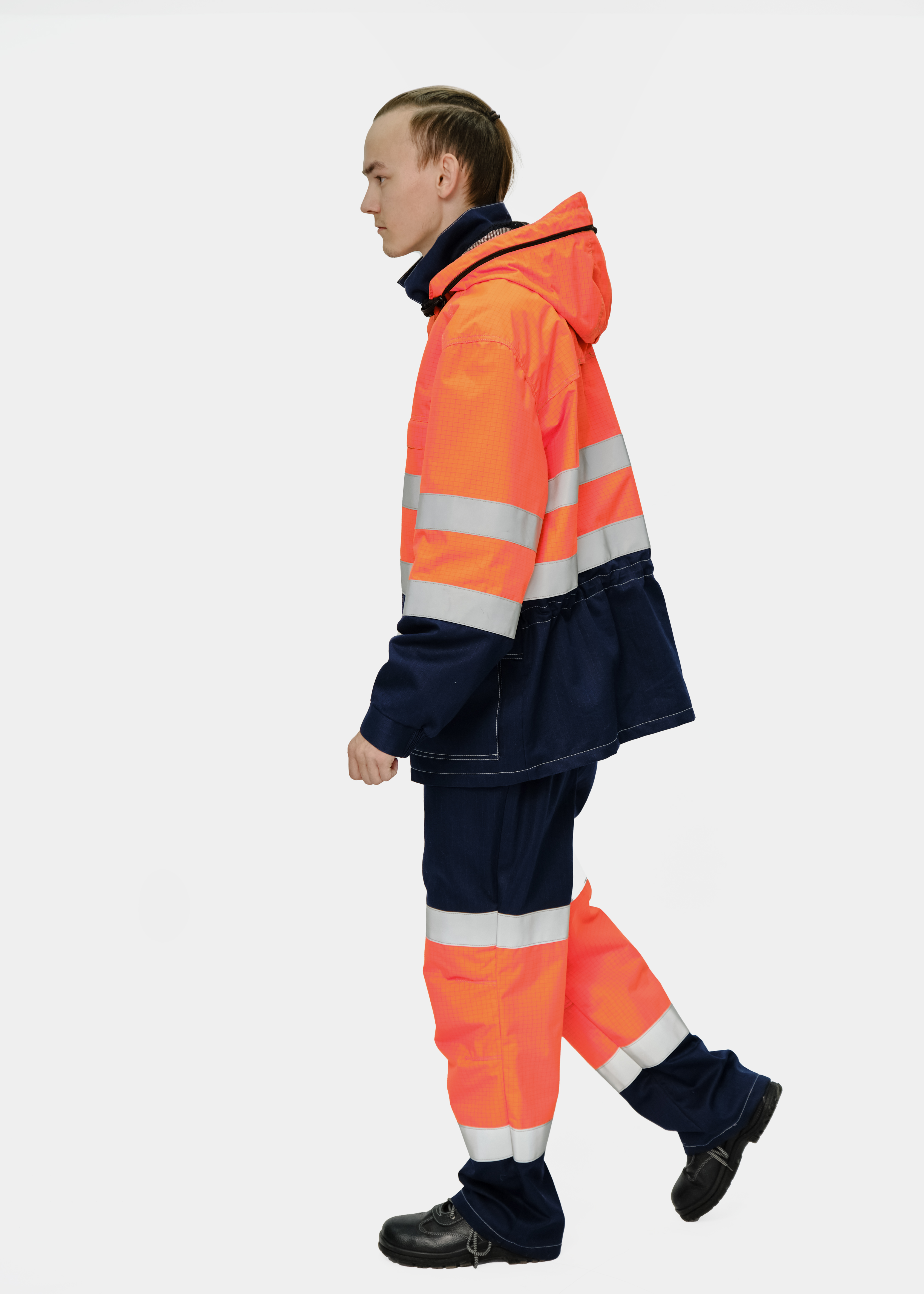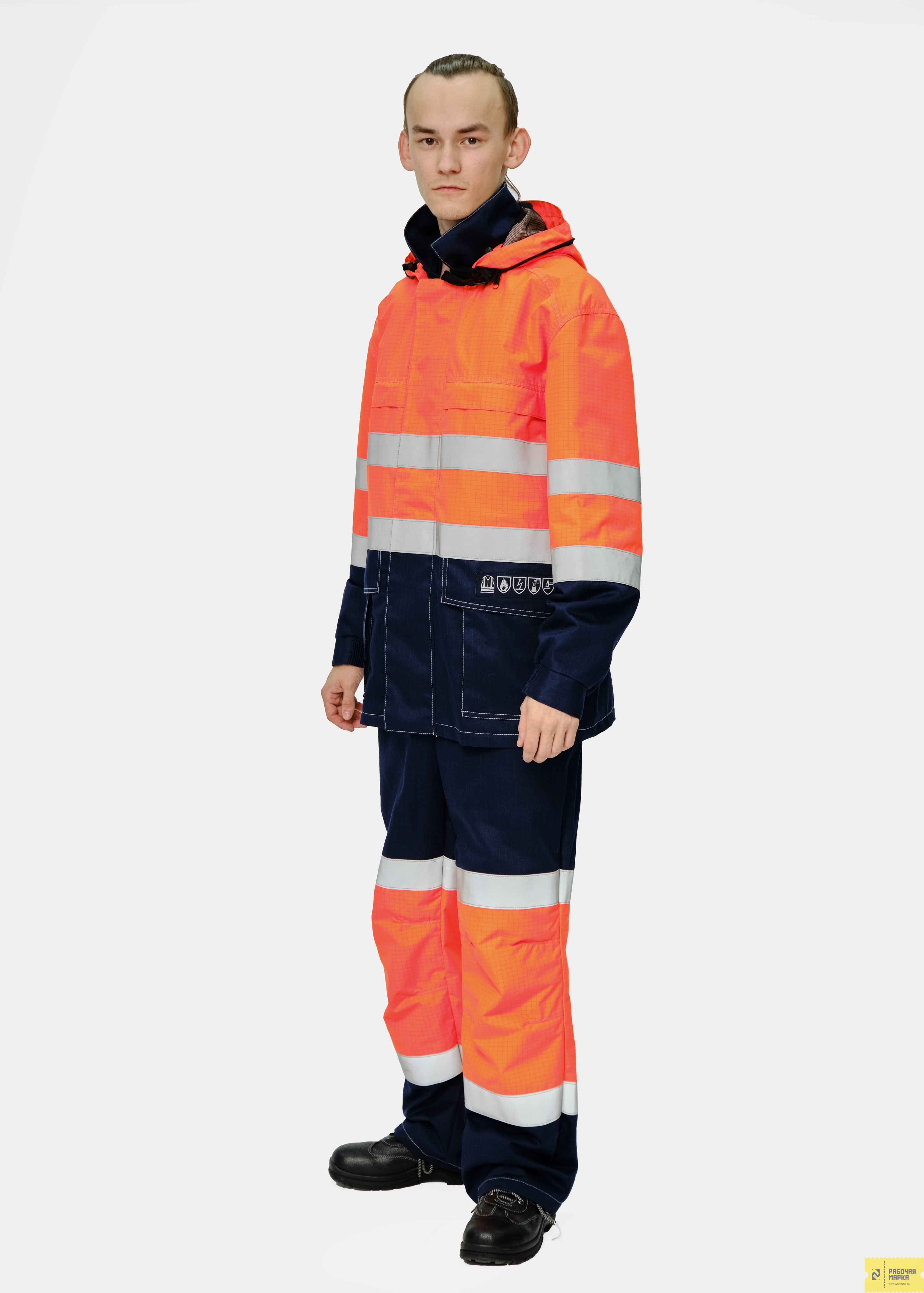 Костюм мужской сигнальный летний для защиты от нефти и нефтепродуктов, повышенных температур, теплового излучения, конвективной теплоты, статического электричества, общих производственных загрязнений и механических воздействий.