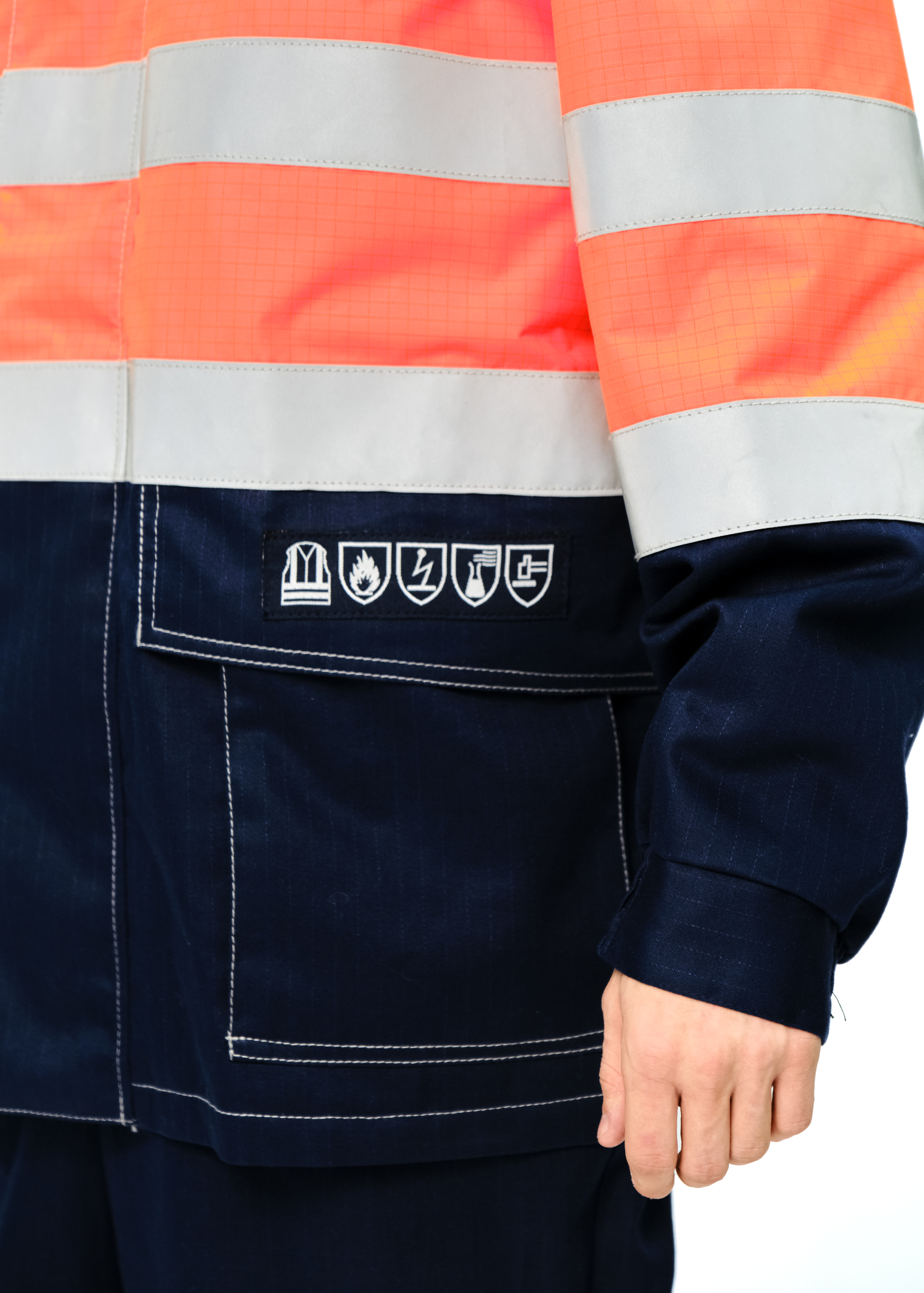 Материал верха: ткань хлопкополиэфирная с огнестойкой пропиткой и нефтемасловодоотталкивающими свойствами, 75% Хлопок, 24% ПЭ, 1% Антистатическая нить, 260 г/м²