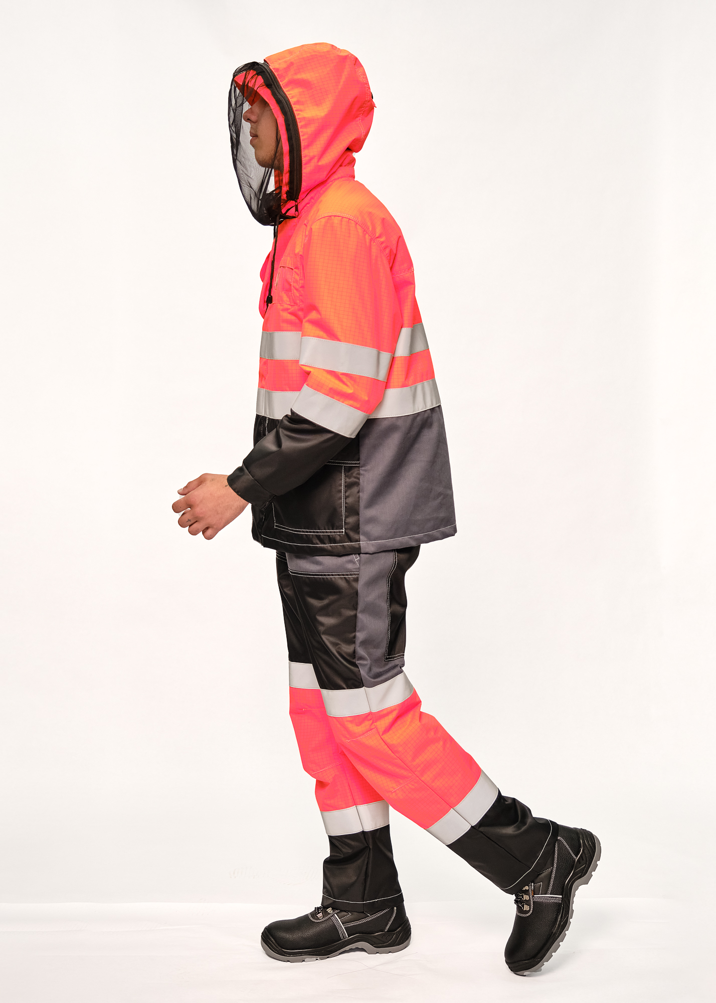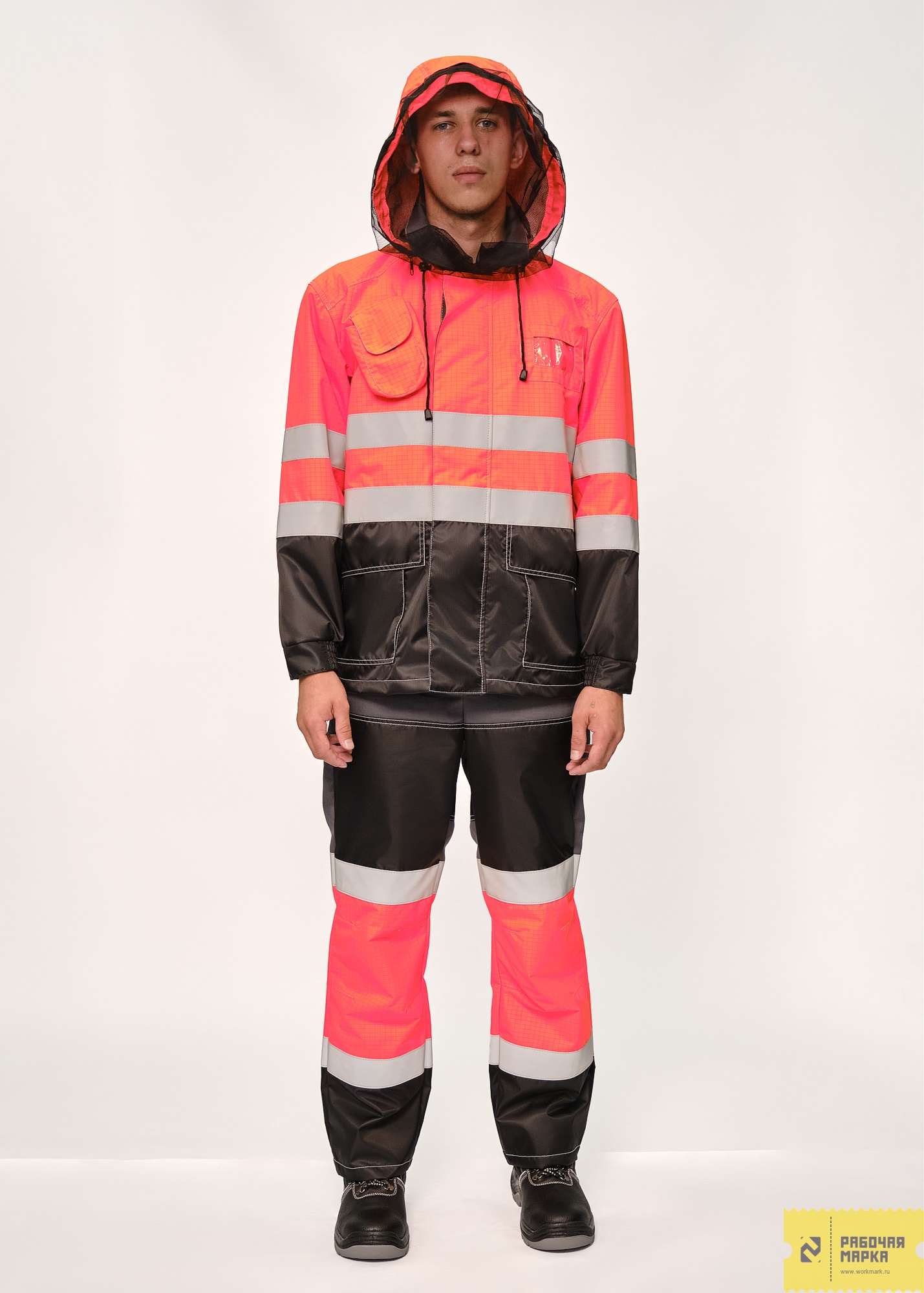 Капюшон с козырьком, с противомоскитной сеткой, которая убирается в карман на капюшоне, пристегивается к куртке на молнию, регулируется по лицевому вырезу шнуром с фиксаторами и наконечниками, сзади – патой с пуговицами.