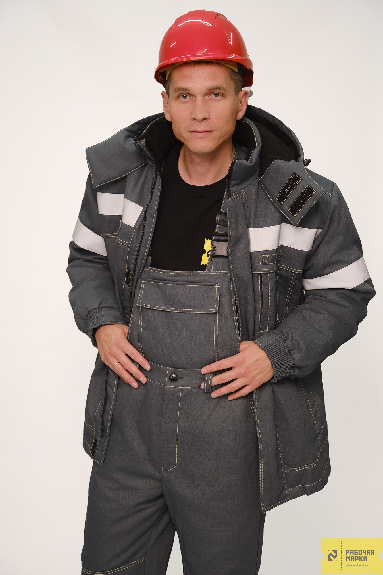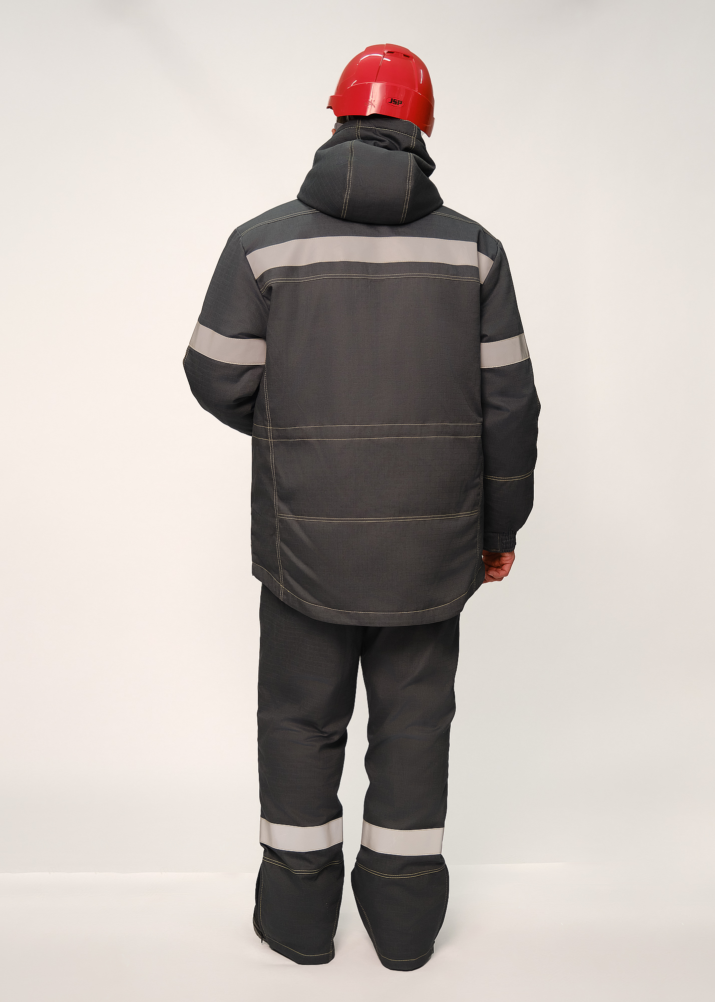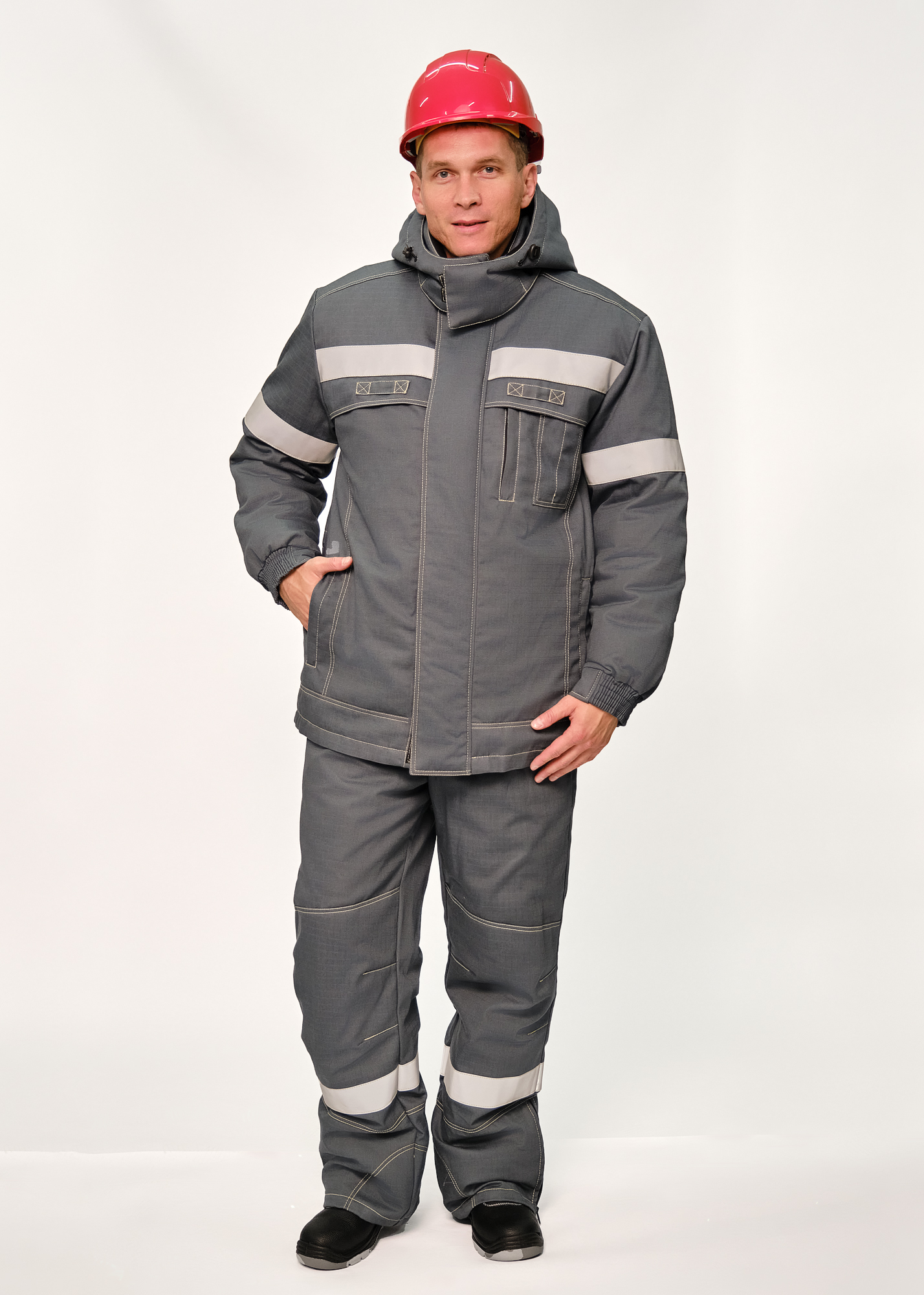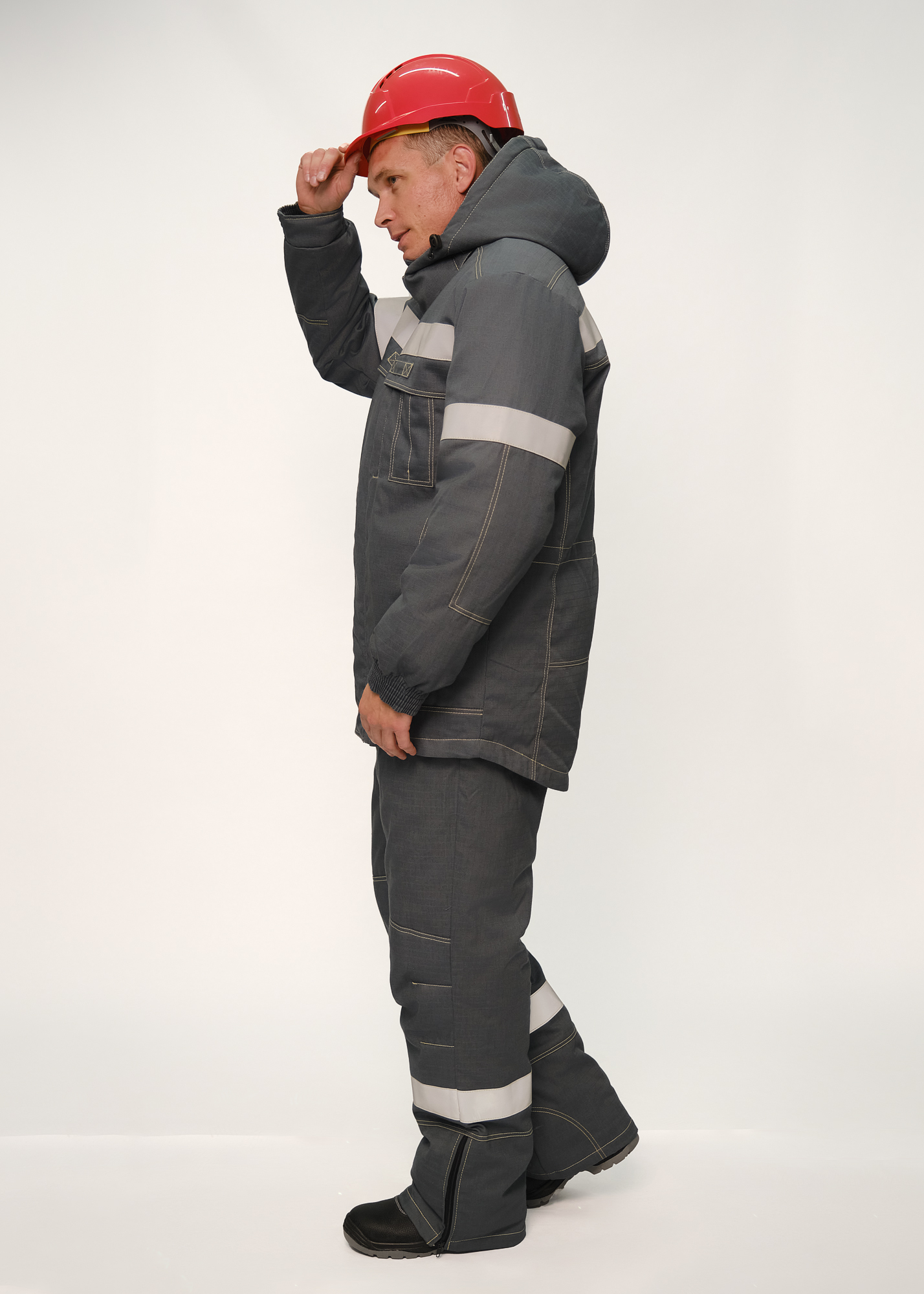 Костюм мужской зимний состоит из куртки и брюк с пристегивающейся теплозащитной подкладкой.