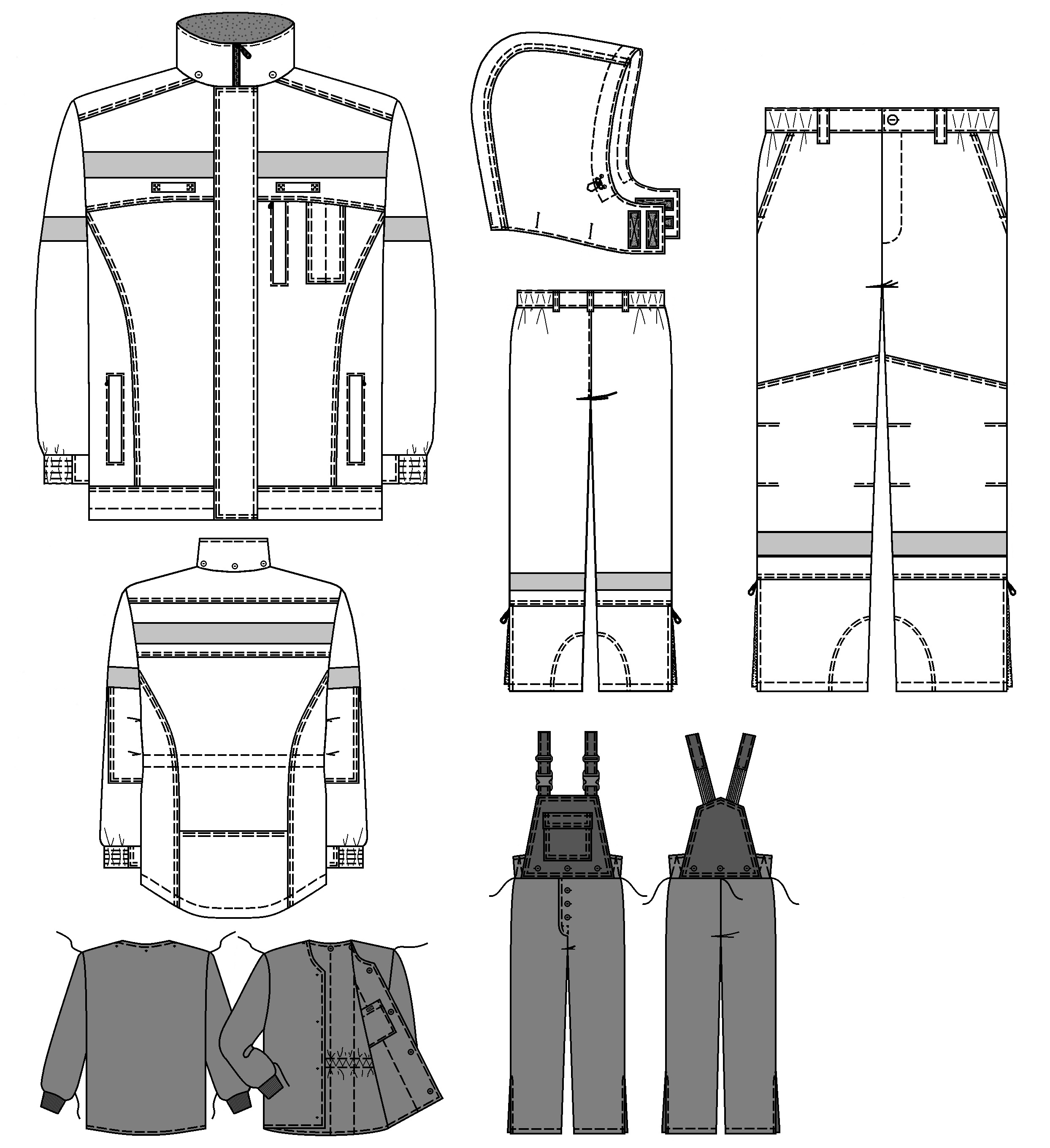Полочки с центральными частями, с кокетками, с рельефными швами, с фигурными клапанами от кокетки с настрочными петлями для рации и газоанализатора, с боковыми прорезными карманами с застежкой-молнией и с листочкой.