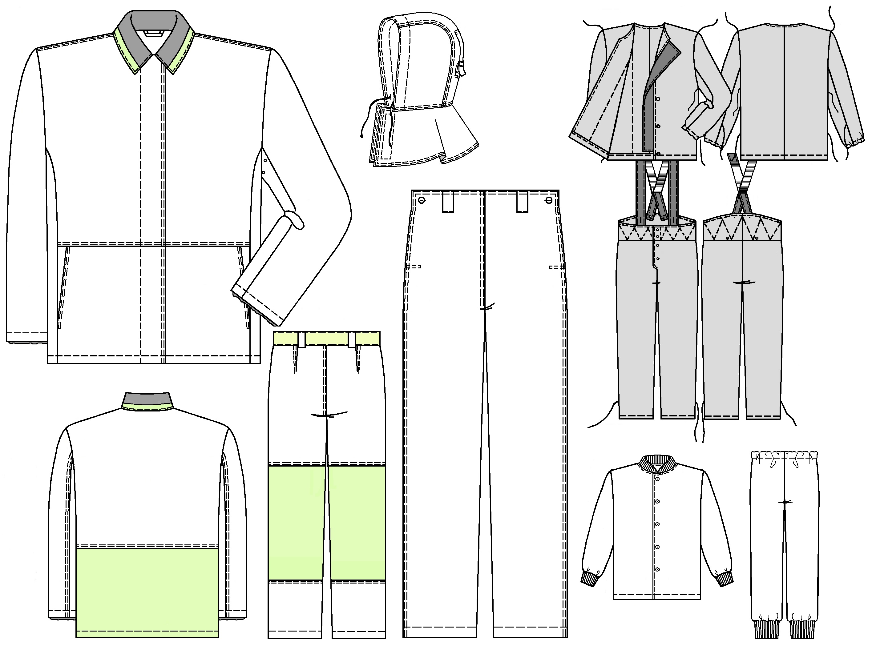Костюм мужской состоит из куртки, брюк с пристегивающимся утеплителем, утепленного белья, подшлемника.