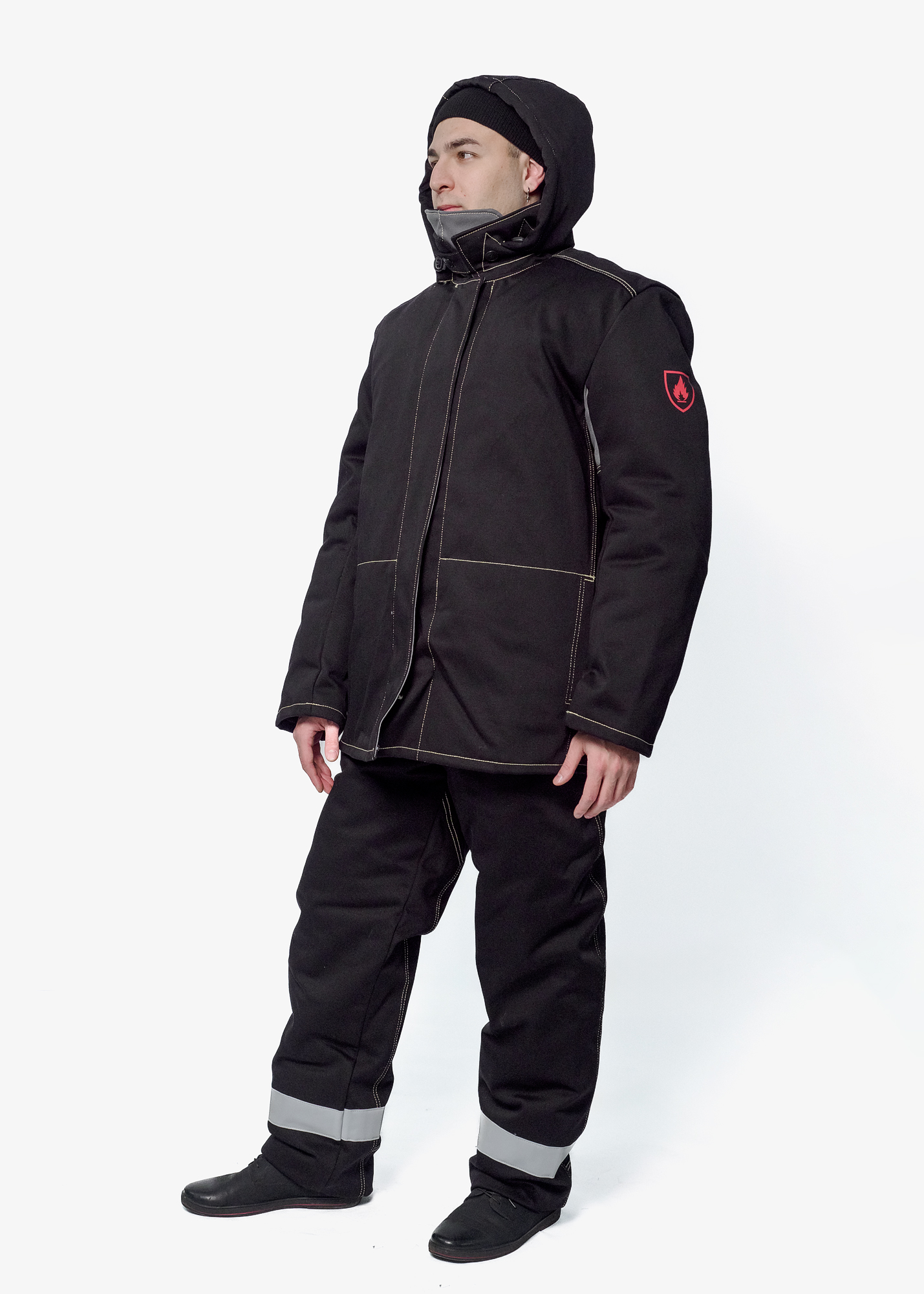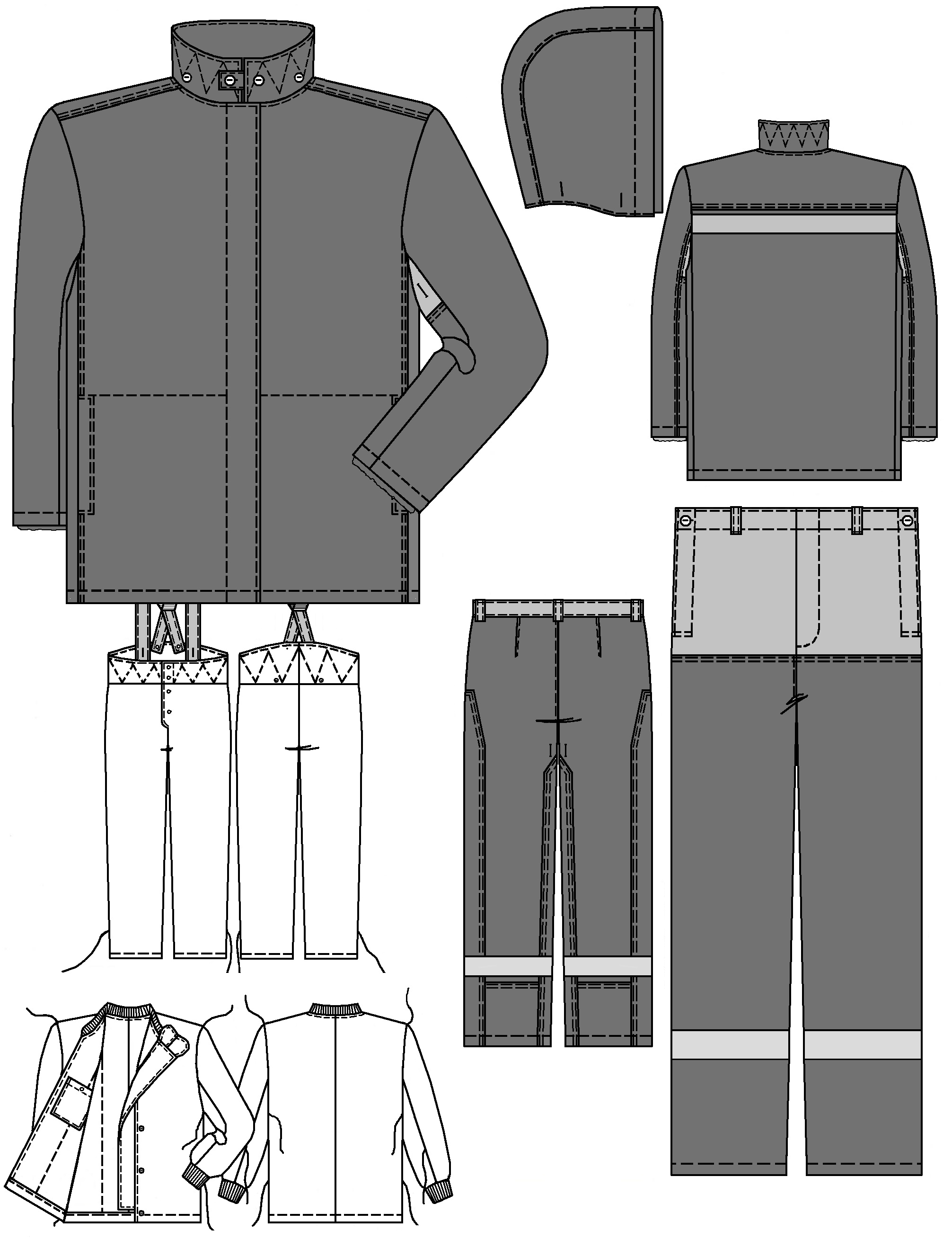 Материал верха и накладок: ткань хлопчатобумажная с огнестойкой пропиткой 350-500 г/м2.