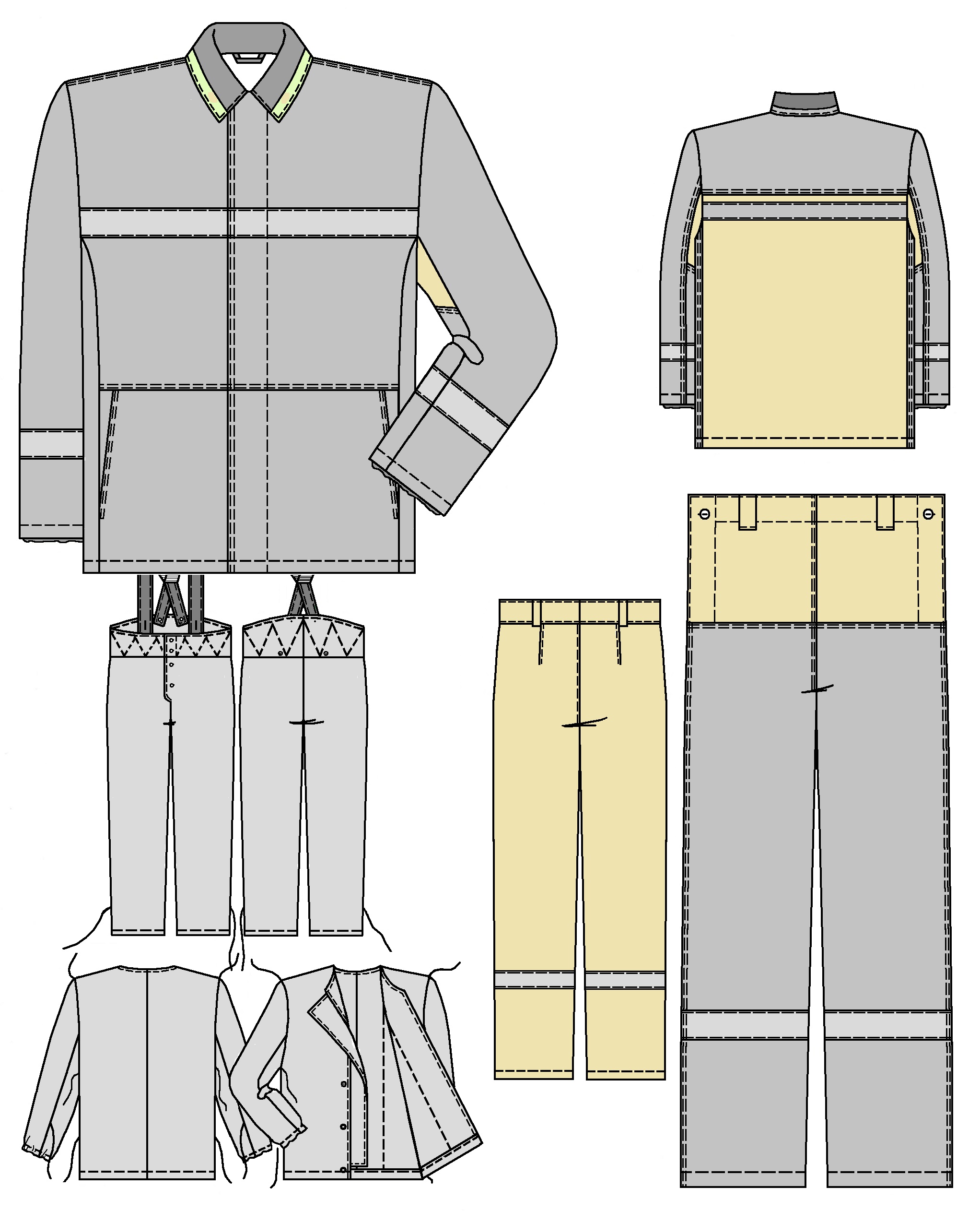 Куртка с внутренним ветрозащитным клапаном, низ рукавов стягивается эластичной тесьмой. Брюки с притачным расширенным утепленным поясом, съёмными бретелями со вставками из эластичной ленты, с застежкой спереди.