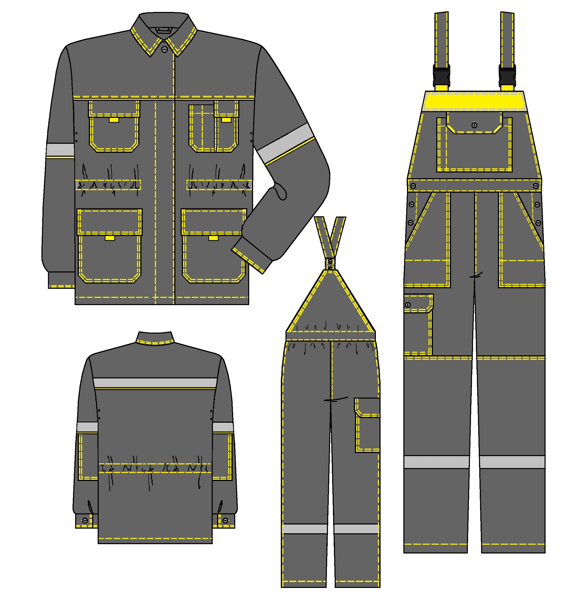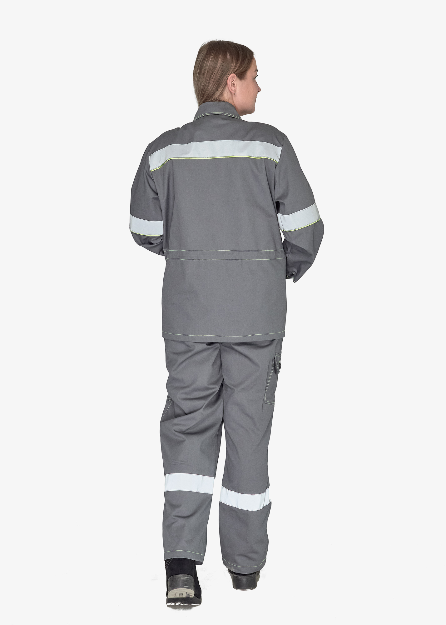 Сигнальные элементы: световозвращающие полосы шириной 50 мм - по передним и задним половинкам полукомбинезона, световозвращающие полосы шириной 50 мм с отделочным кантом под лентой по нижнему краю – по спинке и рукавам.