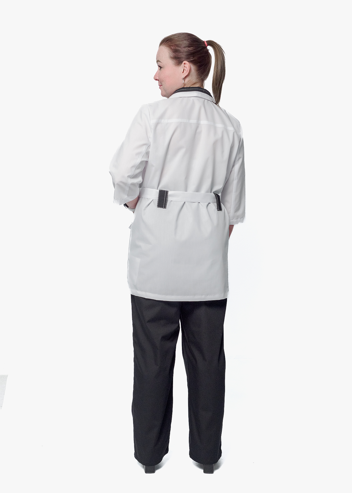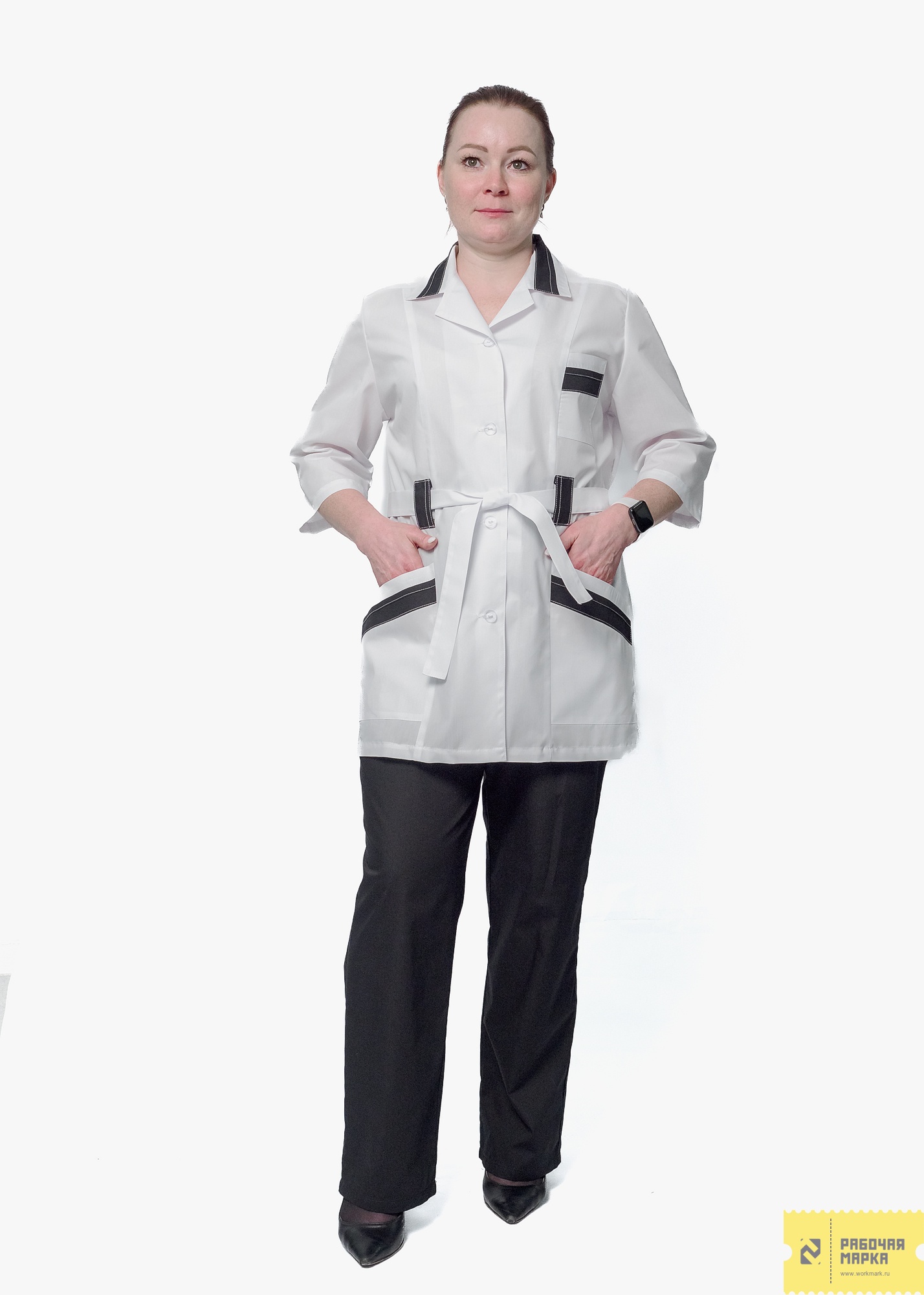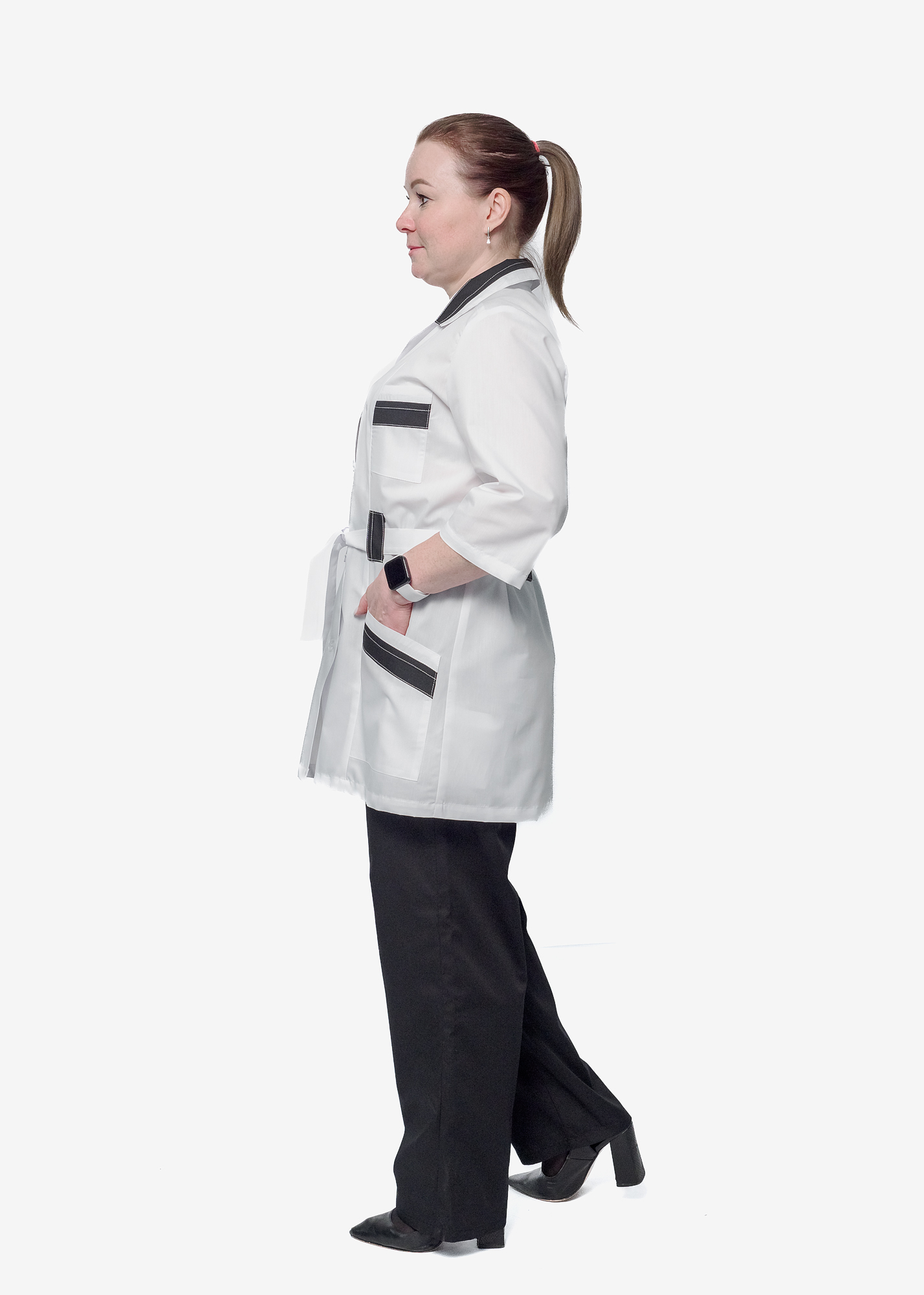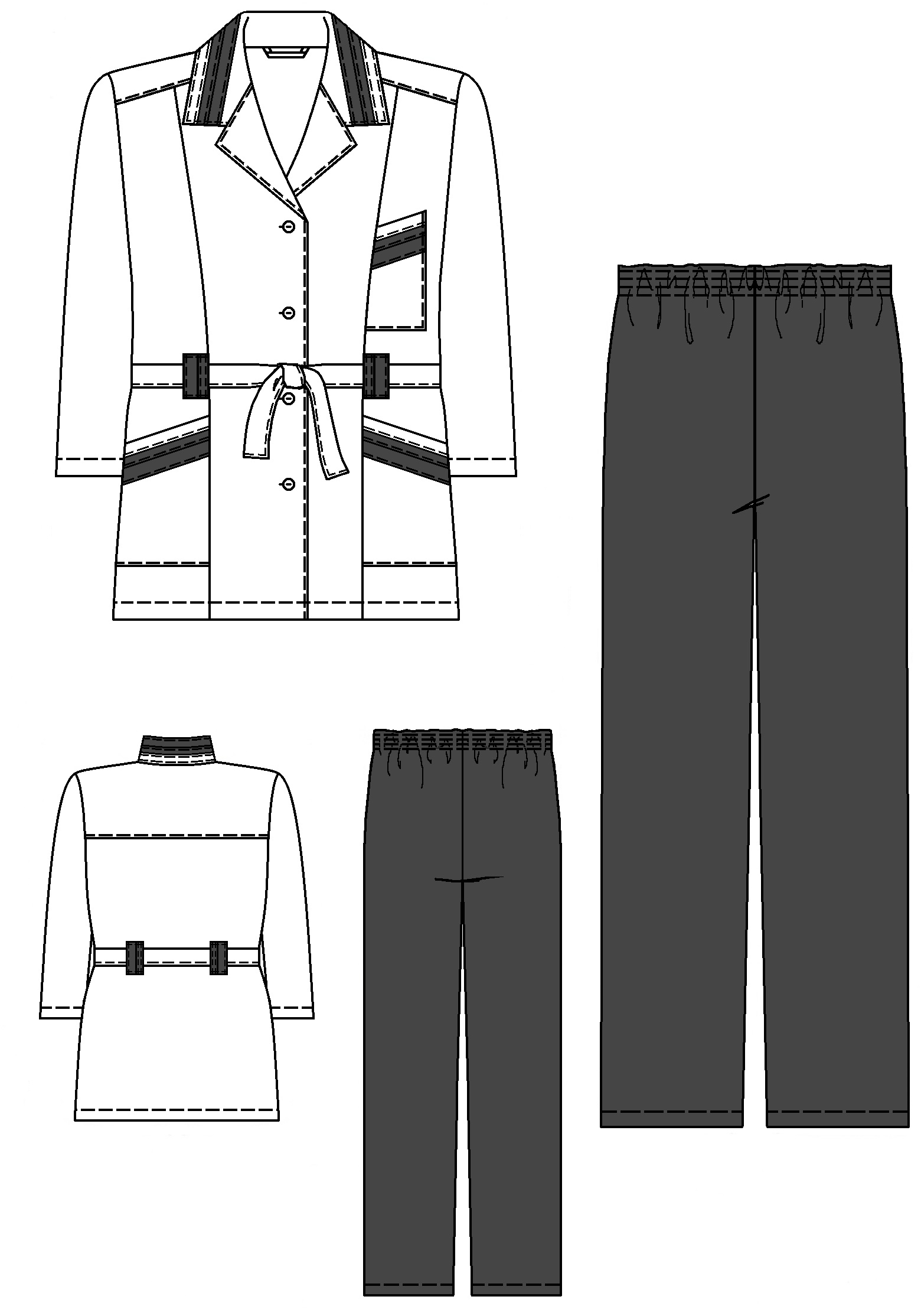 Полочки с рельефами из швов притачивания кокеток полочек, с левым нагрудным и боковыми накладными карманами с отделочными бейками.