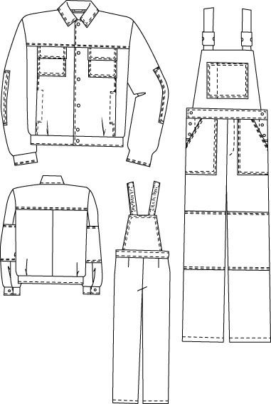 Костюм состоит из куртки и полукомбинезона. Куртка с притачным поясом, центральной застежкой на пуговицы. Полочки с кокетками, с накладными нагрудными карманами с клапанами и боковыми карманами в вертикальном рельефе. Спинка с кокеткой, со средним швом. Рукава с притачными манжетами, застегивающимися на пуговицы. Воротник отложной.