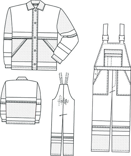 Полочки, спинка, рукава куртки, низ передних и задних половинок полукомбинезона-с двумя световозвращающими полосами шириной 5,0 см.