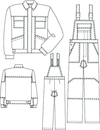 Полукомбинезон прямого силуэта, с притачным поясом, с застежкой на 3 пуговицы в правом боковом шве, спереди с гульфиком с застежкой-молнией, с притачными грудкой и спинкой, с бретелями, застегивающимися на фастексы. Передние половинки с фигурными наколенниками, боковыми накладными карманами с наклонным входом. Задние половинки с вытачками. Грудка с комбинированным накладным карманом с клапаном, застегивающимся на контактную ленту. В области шаговых швов расположены усилительные накладки.