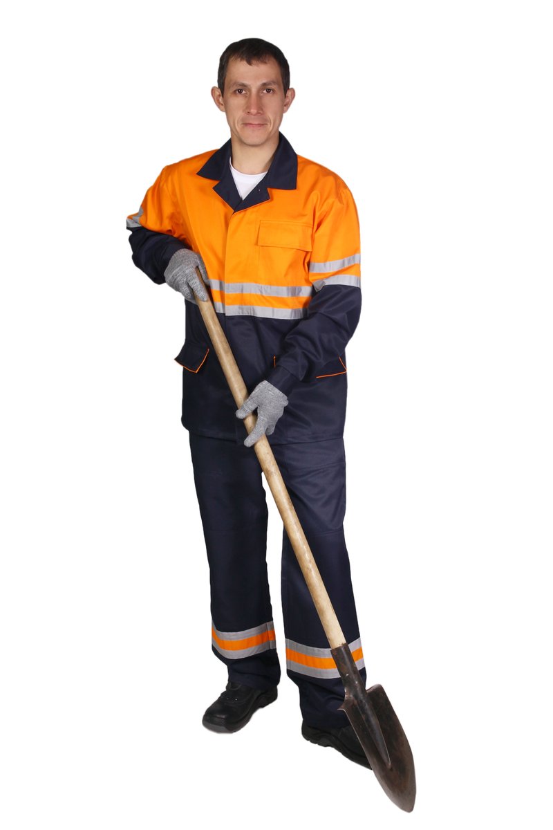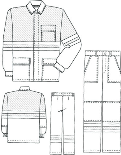 Костюм мужской состоит из куртки и брюк. Куртка прямого покроя с центральной бортовой потайной застежкой на 4 пуговицы и верхней сквозной, с отложным воротником. Полочки из двух частей, с накладными боковыми и левым нагрудным накладными карманами с клапанами. Спинка из двух частей. Рукава втачные длинные из двух частей с налокотниками, с манжетами, застегивающимися на пуговицу. По краям клапанов боковых карманов образован кант из отделочной ткани. Брюки прямые, с притачным поясом на пуговице, пятью шлевками, с застежкой-молнией. Передние половинки с наколенниками, боковыми накладными карманами с наклонным входом. Задние половинки с вытачками. По низу верхних частей полочек, спинки и рукавов и в нижней части передних и задних половинок брюк проложены по два ряда светоотражающей ленты. Верхние части полочек, спинки, рукавов и вставки между световозвращающими полосами на брюках выполнены из отделочной ткани.