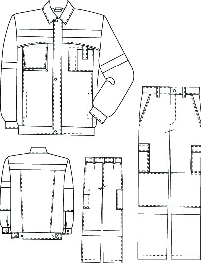 Костюм мужской состоит из куртки и брюк. Куртка удлиненная с центральной потайной застежкой-молнией, с планкой, застегивающейся на кнопки, с притачным поясом. Полочки с кокеткам, с рельефными швами, с нагрудными накладными карманами с фигурными клапанами и боковыми карманами в швах. Правый нагрудный карман - накладной объемный, левый - накладной с отстрочкой для карандаша и с карманом для мобильного телефона. Спинка с кокеткой, со складками для обеспечения свободы движения. Рукава втачные из трех частей, с налокотниками, с манжетами, застегивающимися на кнопки. Ширина куртки по низу регулируется при помощи пат с кнопками. Брюки прямые с центральной застежкой-молнией, с притачным поясом, застегивающимся на пуговицу, пятью шлевками, с накладными объемными карманами с клапанами на боковых швах выше наколенника. Передние половинки с боковыми карманами с отрезными бочками, с наколенниками. Задние половинки с вытачками. По низу кокеток полочки и спинки, по рукавам выше линии локтя, на передних и задних половинках ниже уровня колена расположена световозврашающая лента шириной 5,0см.