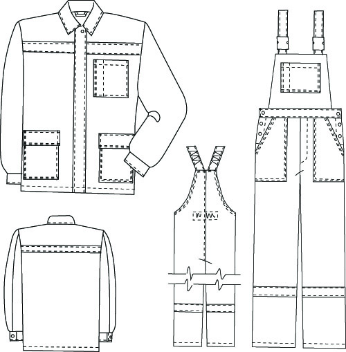 Полукомбинезон с боковыми застежками на пуговицы с эластичной тесьмой на спинке. Передние половинки с боковыми накладными карманами, с центральной застежкой на пуговицы. На груди накладной карман с отделением для карандаша. Бретели с эластичной тесьмой застегиваются на фастексы. Кокетки полочки и спинки из отделочного материала
