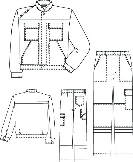 Брюки прямого силуэта, с центральной застёжкой на 2 пуговицы, с притачным поясом, застёгивающимся на 1 пуговицу, с 5 шлевками. Передние половинки брюк с отрезными вставками входа в карман из отделочной ткани красного цвета, с боковыми накладными карманами с наклонным входом, с наколенниками. Задние половинки с вытачками, с задним накладным карманом и карманом для инструмента на правой половинке. Карман для инструмента состоит из двух частей, нижняя часть - из ткани красного цвета, верхняя - «василек». На левом боковом шве расположен накладной карман с клапаном, застегивающийся на контактную ленту. Пояс по бокам стянут эластичной лентой.