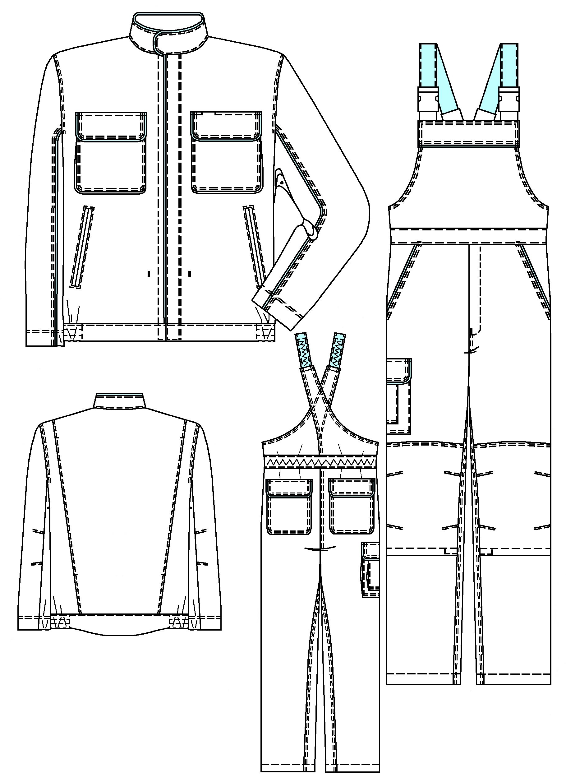 Передние половинки с боковыми карманами, наколенниками – карманами для амортизационных накладок с контактной лентой, с вытачками в области колена.