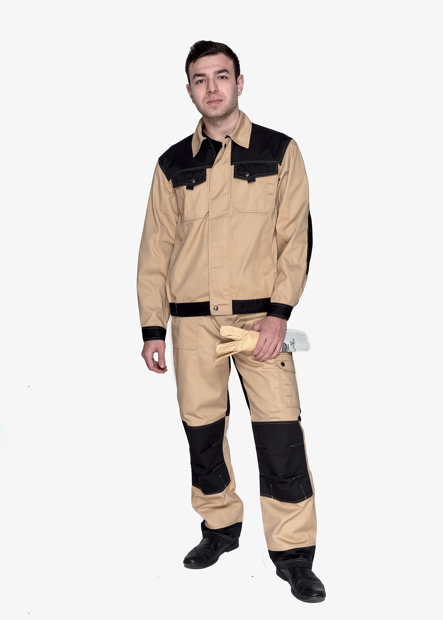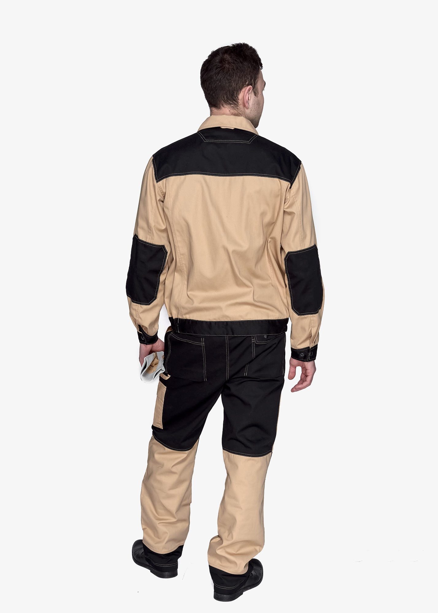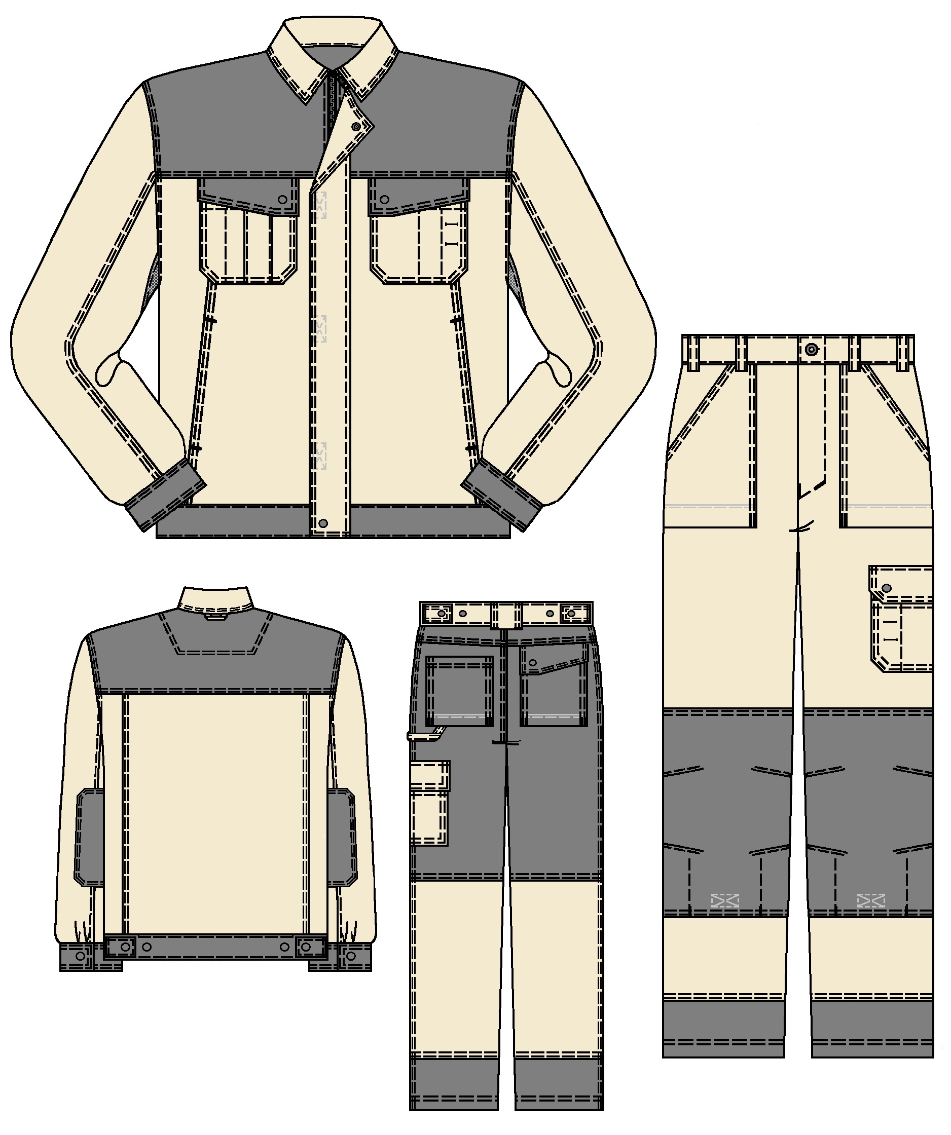 Задние половинки с кокетками, накладными карманами, петлей для молотка.