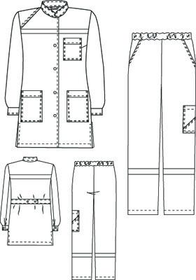 По швам притачивания кокеток полочек и спинки, по передним и задним половинкам брюк внизу расположена световозвращающая лента шириной 25 мм.