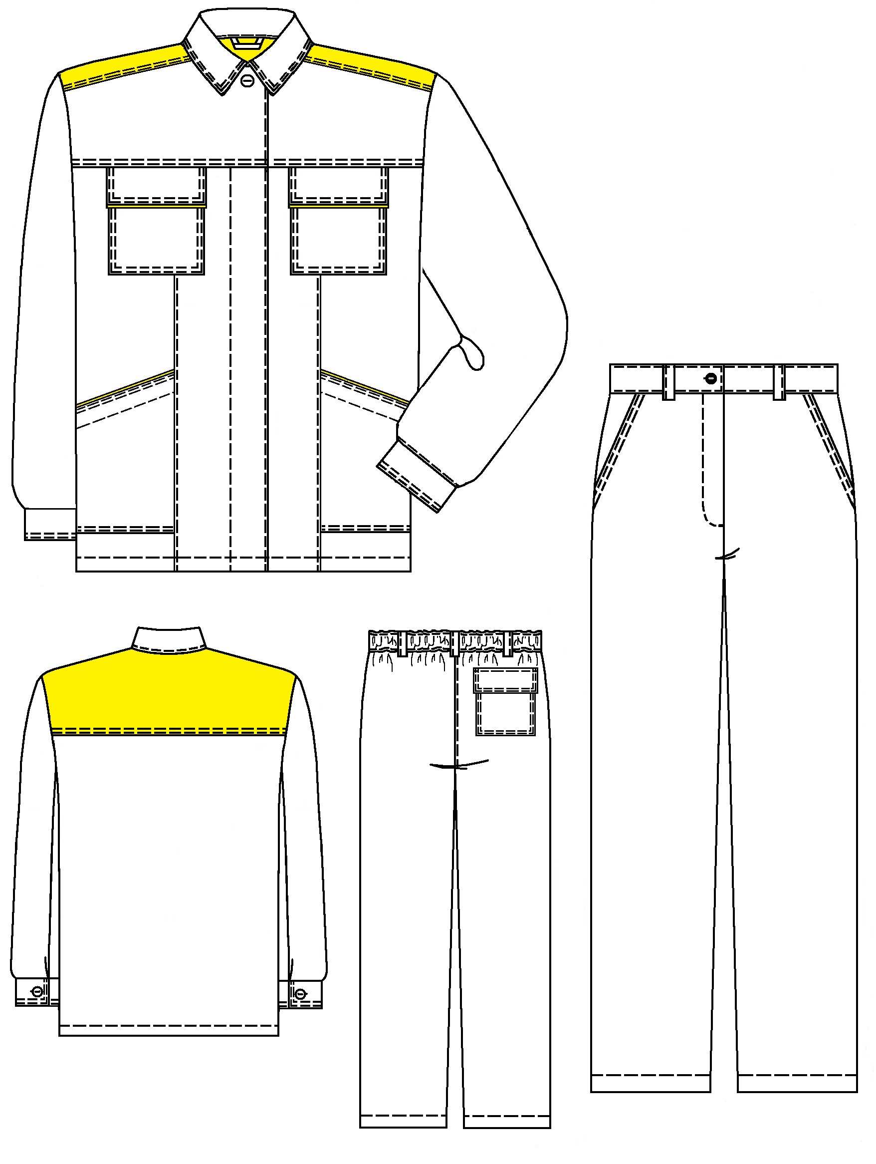 Полочки с кокетками, с рельефными швами, с нагрудными накладными карманами с клапанами с контактной лентой, с боковыми накладными карманами.