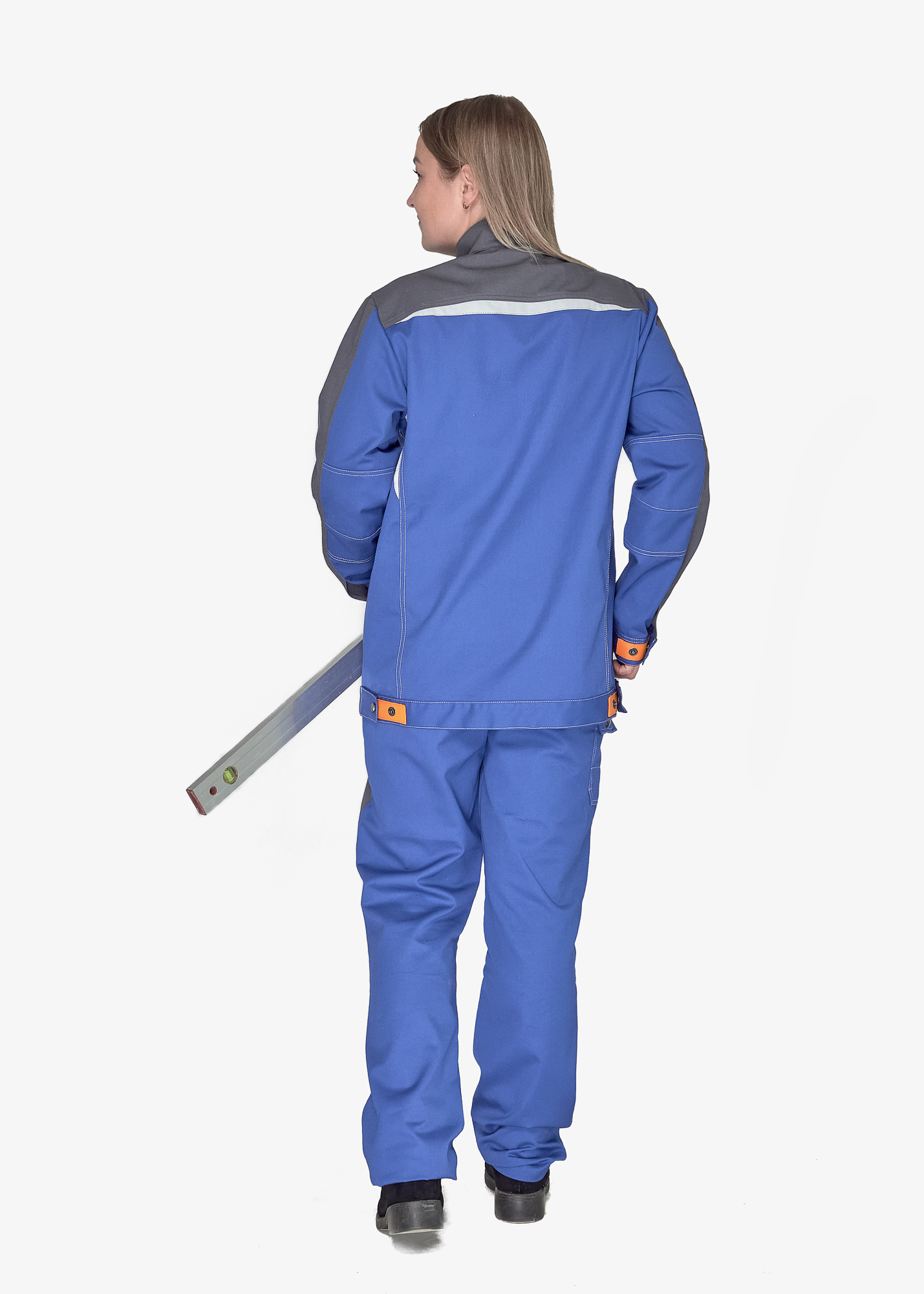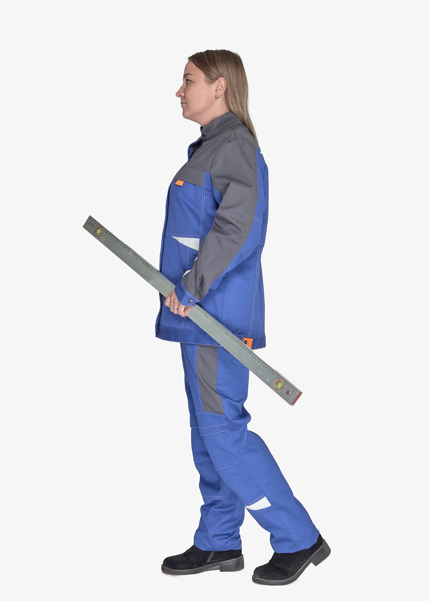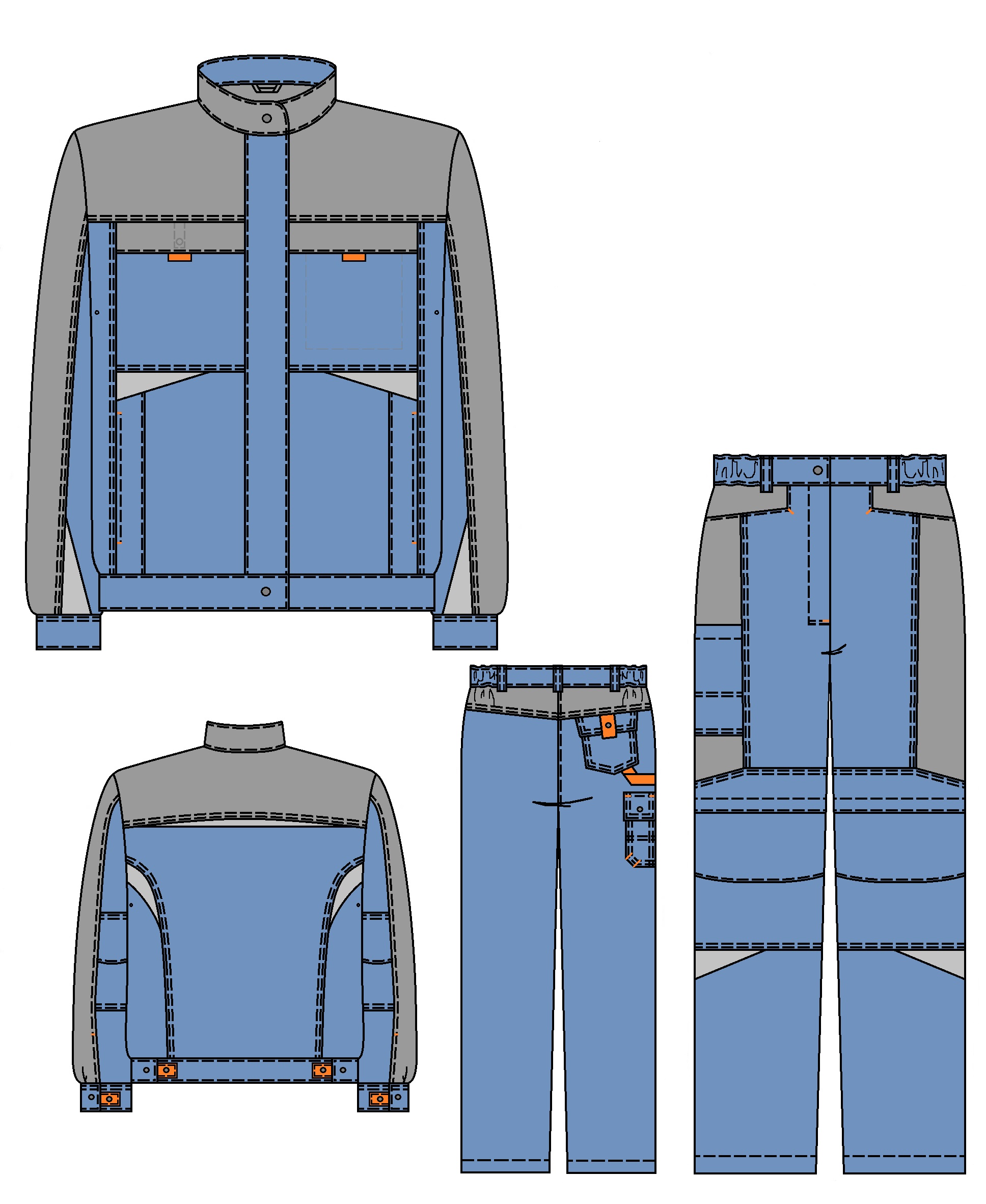 Передние половинки из частей с боковыми карманами с отрезными бочками, с объемными наколенниками-карманами для амортизационных вкладышей со входом в верхней части на контактную ленту.