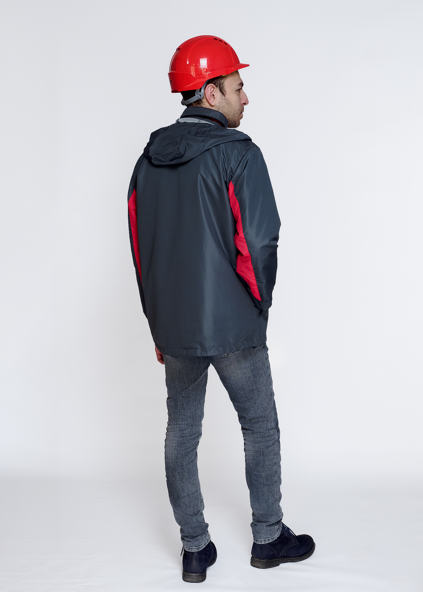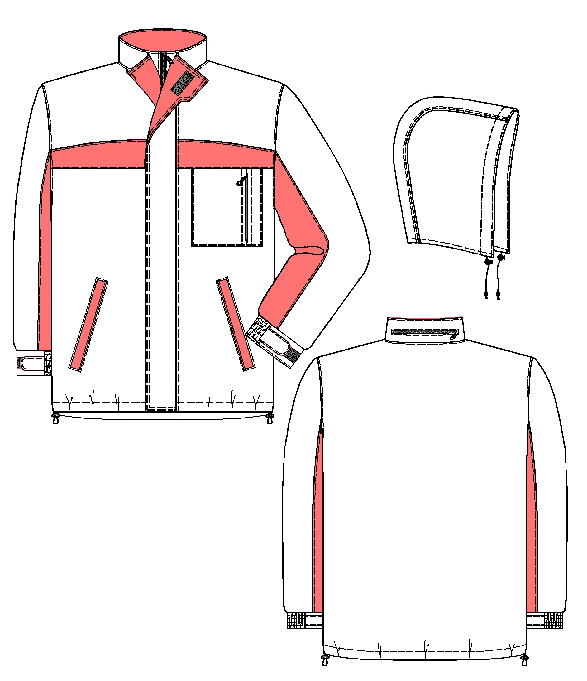 Капюшон притачной, со шнуром и фиксаторами по лицевому вырезу, складывается и убирается в воротник.