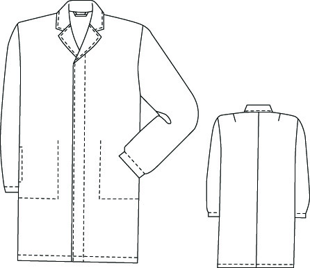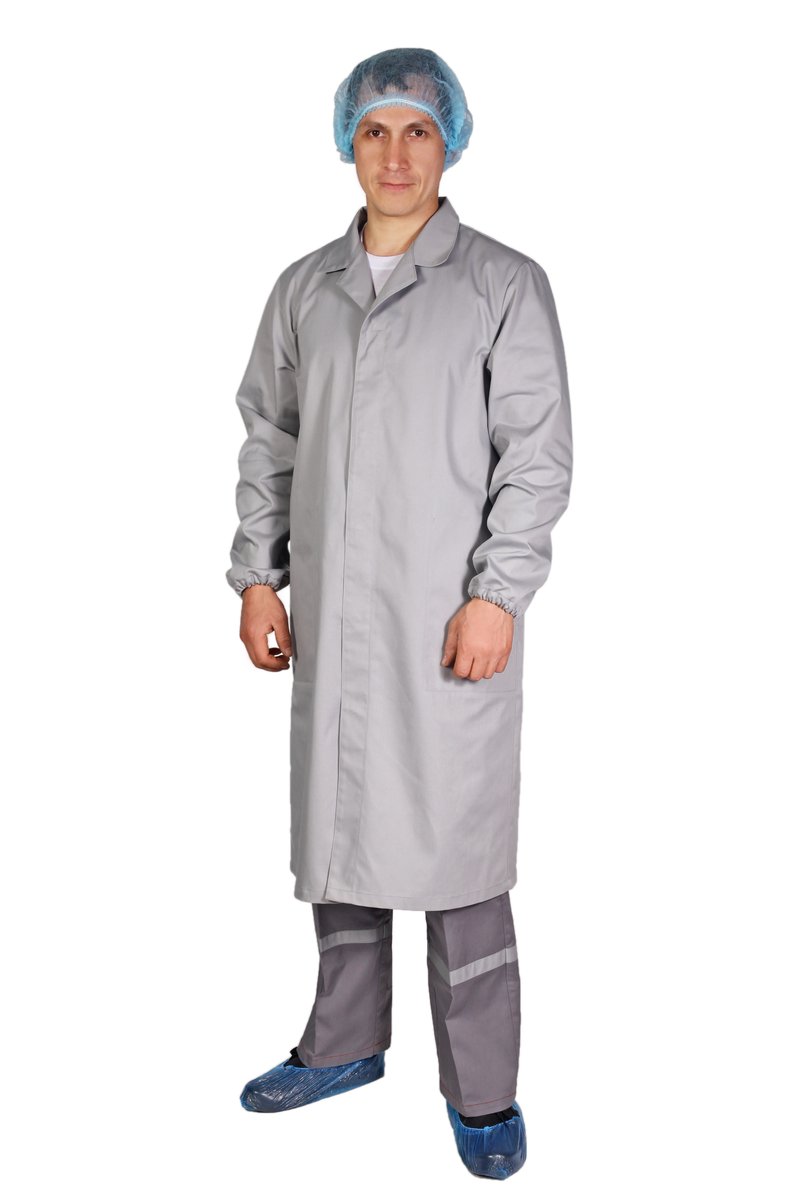 Халат мужской с центральной бортовой потайной застёжкой на 5 кнопок с лацканами, с карманами в боковых швах, настроченных на полочки. Спинка со средним швом, с плечевой вытачкой. Рукава втачные длинные, по низу стянуты эластичной лентой. Воротник отложной.