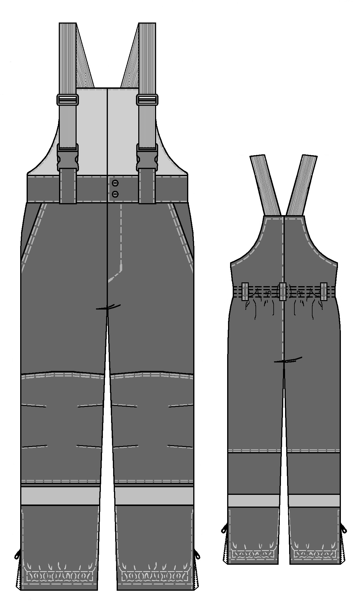 Передние половинки с боковыми карманами с отрезным бочком, с наколенниками, вытачками для придания объема в области колена.