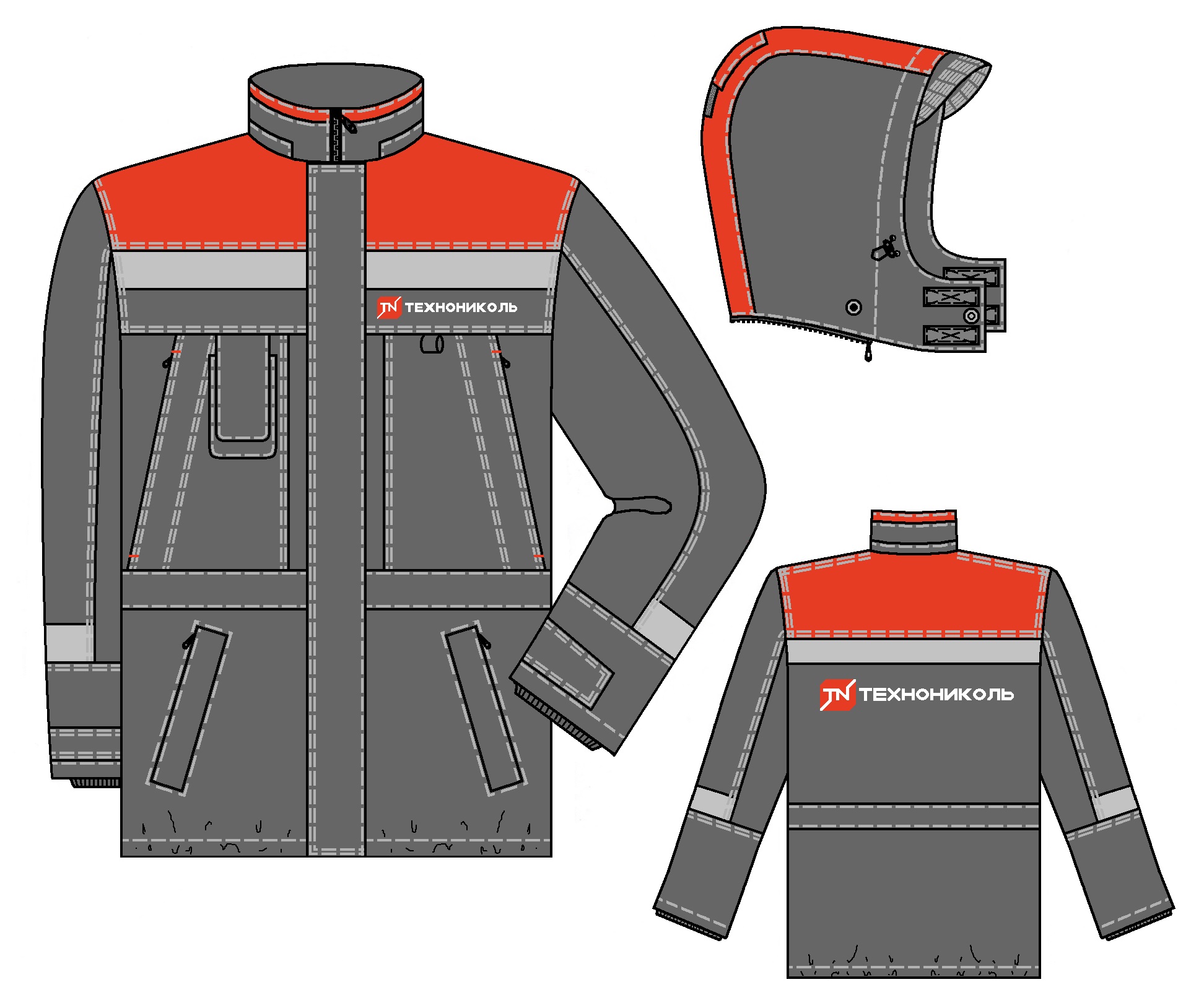 Утепленный капюшон с козырьком пристегивается к куртке на молнию, застегивается на контактную ленту, регулируется по лицевому вырезу эластичным шнуром с фиксаторами, сзади – патой на контактной ленте, подбородочная часть в расстегнутом виде фиксируется на кнопку.