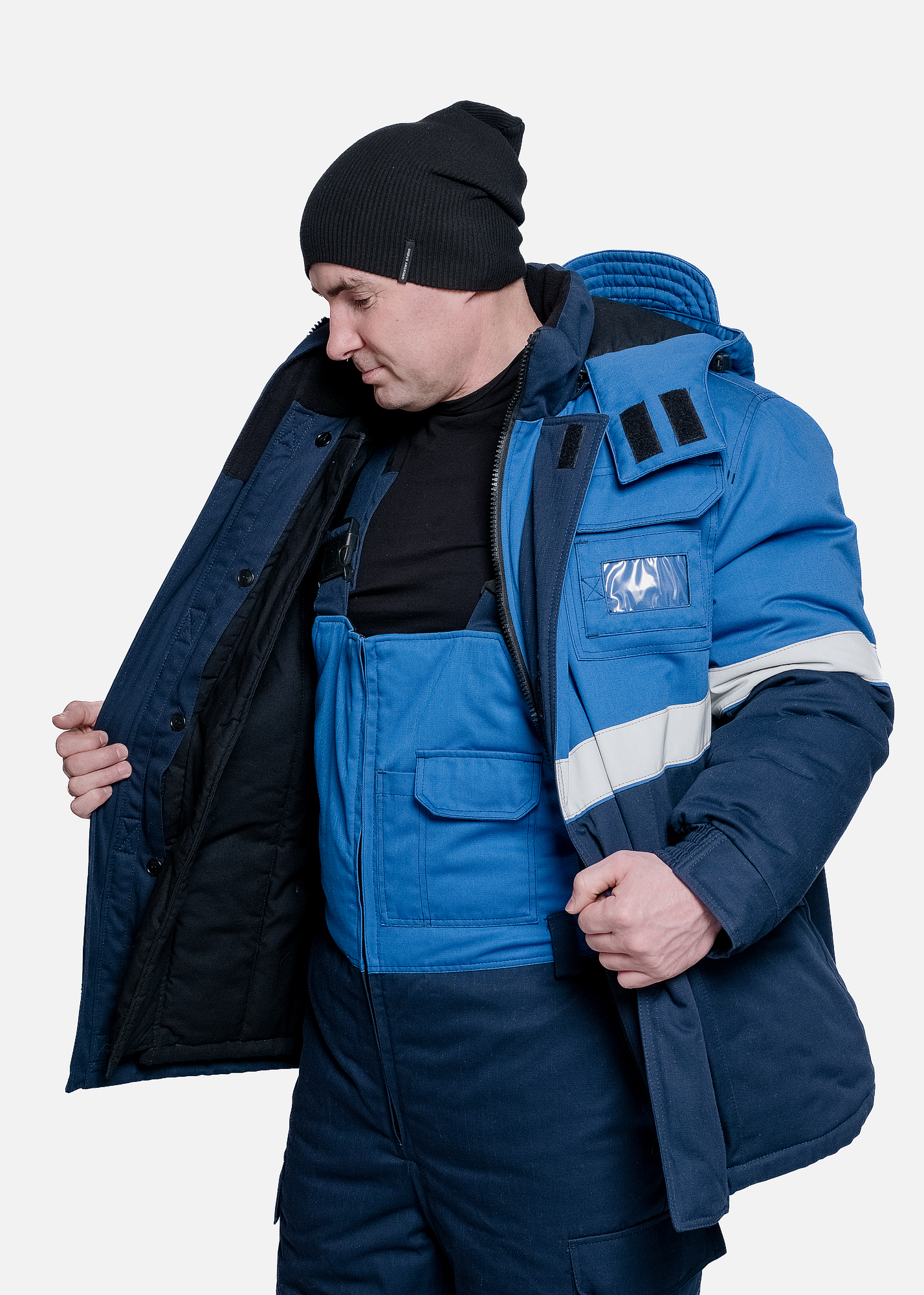 Съемный утеплитель с утеплительным клапаном, с нагрудным накладным карманом с контактной лентой. Рукава подкладки с трикотажными