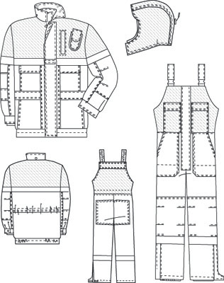 Полукомбинезон с притачными грудкой и спинкой, центральной застёжкой на «молнию», нагрудными и боковыми карманами, наколенниками, разрезами в боковых швах, застёгивающимися на «молнию». Спинка по линии талии и бретели стягиваются эластичной тесьмой. В нижней части брюк проложена светоотражающая полоса.