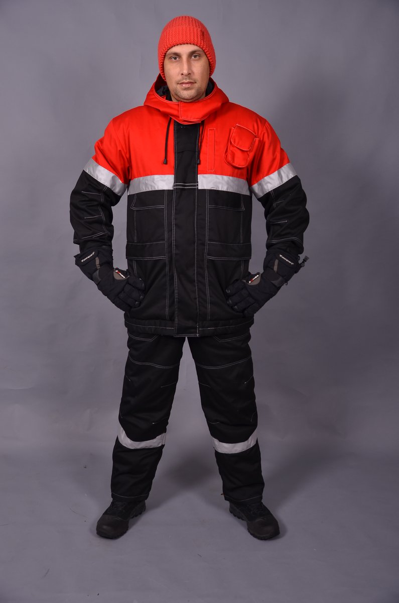 Куртка с центральной застежкой на «молнию», ветрозащитным клапаном, с пристегивающимся на пуговицы капюшоном. Полочки с кокетками, верхними, боковыми карманами, карманами для средств связи. Спинка с кокеткой, кулиской по линии талии. Рукава втачные, с кокетками, налокотниками, низ рукавов с манжетами на пуговицах. Воротник отложной, верхний воротник из флиса. По низу кокеток полочек, спинки и рукавов проложена светоотражающая полоса.