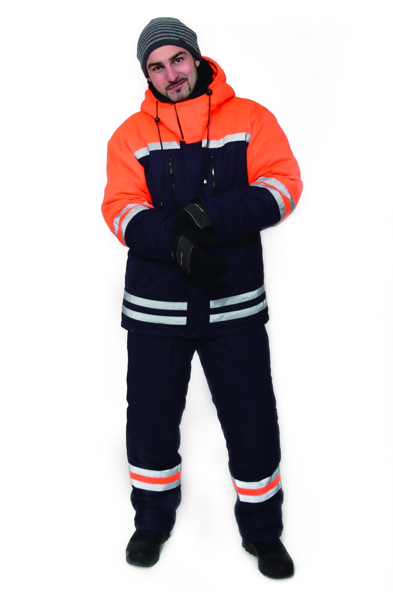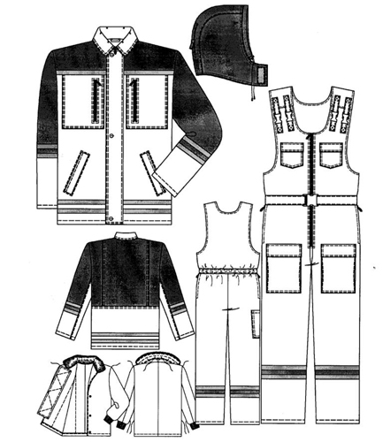 Пристегивающийся меховой воротник прикрепляется при помощи 5 пуговиц к горловине куртки и 5 пуговиц по отлету Воротник застегивается на пату с кнопкой. Капюшон пристёгивается к куртке при помощи пуговиц, стягивается по лицевому вырезу шнуром с фиксаторами. Для прилегания куртки по низу пояс в области боковых швов стянут эластичной лентой. Брюки с центральной застежкой-молнией, с притачным поясом, застегивающимся на 2 кнопки с 5 шлевками Передние половинки с боковыми прорезными карманами в рамку с застежкой-молнией с наклонным входом Задние половинки с вытачками. По низу шаговых швов расположены усилительные накладки, по низу боковых швов - разрезы с застежкой-молнией, с пуфтой и с клапаном, застегивающимся на кнопки. По швам притачивания кокеток полочек и спинки куртки, в нижней части передних и задних половинок брюк расположена световозвращающая лента. Материал верха: ткань курточная 65%ПЭ+35%х/б . Подклад: 100 %ПЭ. Утеплитель: холлофайбер 150г/м2 - куртка (2 слоя), брюки (1 слой).