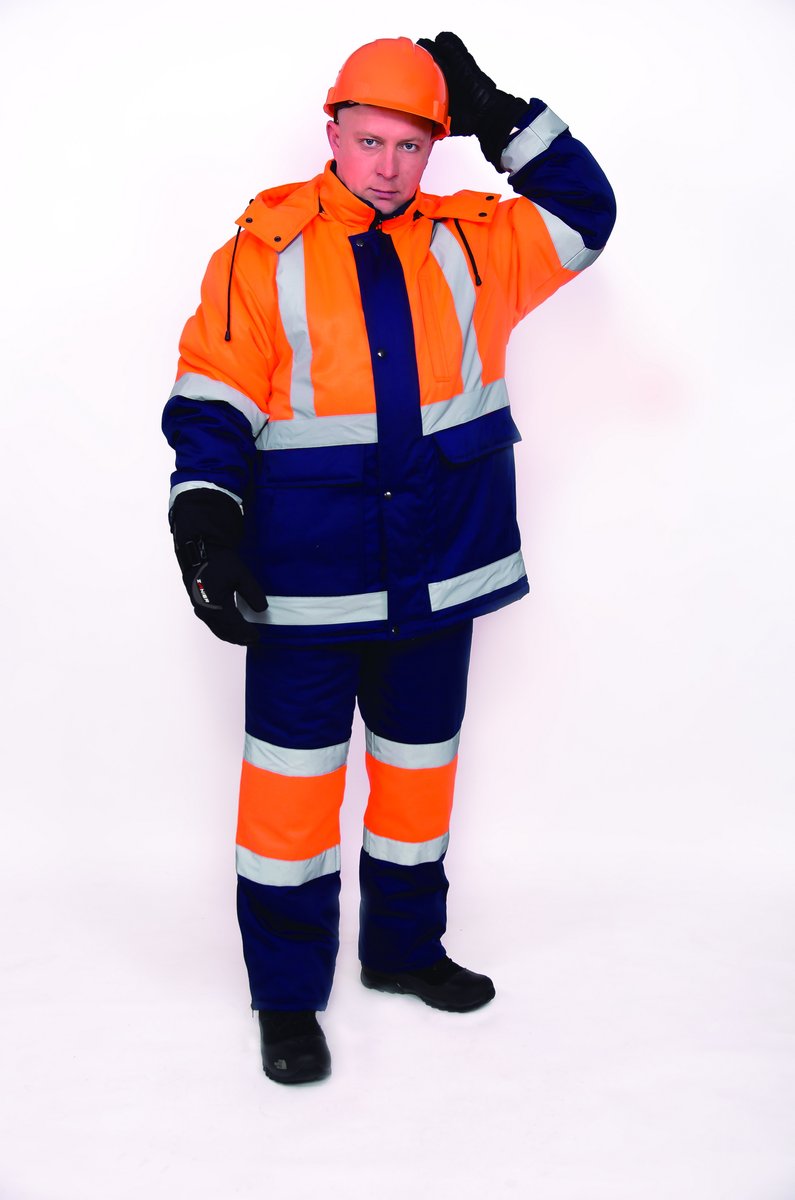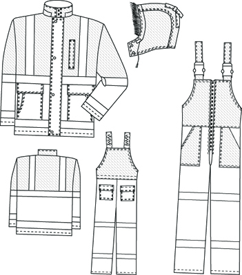 Куртка мужская утепленная с цетральной бортовой застежкой-молнией, утеплительным клапаном, застегивающимся на кнопки, с пристёгивающимся капюшоном. Полочки из двух частей, с боковыми комбинированными накладными карманами с клапанами, застегивающимися на контактную ленту и с левым нагрудным прорезным карманом с молнией. Спинка из двух частей. Рукава втачные из двух частей Воротник - «стойка», внутренний - из флиса. Капюшон пристёгивается к куртке при помощи застежки-молнии, застёгивается при помощи кнопок, стягивается по лицевому вырезу эластичным шнуром и регулируется в затылочной части хлястиком. Куртка с пристегивающимся утеплителем, рукава с трикотажными напульсниками. На левой полочке притачной утепляющей подкладки и пристегивающегося утеплителя -внутренние карманы, застегивающиеся на пуговицу. Полукомбинезон с центральной застежкой-молнией, с отрезными грудками и спинкой, с бретелями с эластичной лентой, на фастексах. Передние половинки с боковыми накладными карманами с наклонным входом. Задние половинки с накладными карманами с клапанами. Полукомбинезон с пристегивающимся утеплителем. Место расположения СВП на костюме согласно ГОСТ 12.4.219-99 третьего класса зашиты.