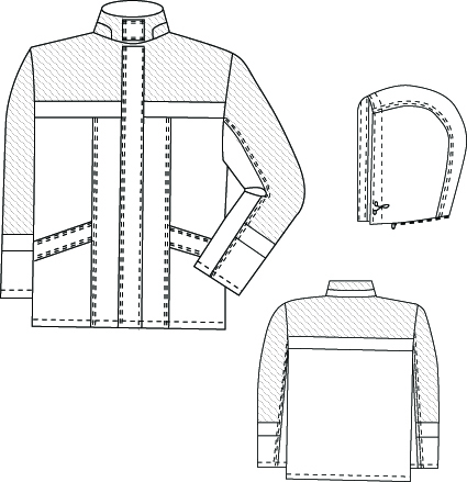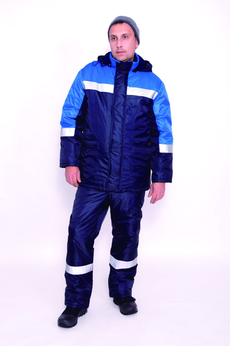Куртка с центральной бортовой застежкой на «молнию», с утеплительным клапаном, застегивающимся на контактную ленту и внутренним ветрозащитным клапаном и кулиской по линии талии Воротник - стойка. Полочки с кокетками, боковыми карманами с клапанами. Спинка с кокеткой Рукава втачные с внутренним трикотажным напульсником. Капюшон пристегивается к куртке при помощи застежки «молния» по лицевому вырезу стягивается эластичным шнуром. Кокетки полочек, кокетка спинки, средние части рукавов выполнены из отделочной ткани. Световозвращающая лента шириной 50 мм настрачивается на кокетки полочек, кокетку спинки и средние части рукавов. Полукомбинезон прямого силуэта с центральной застежкой на «молнию». Передние половинки с боковыми карманами и наколенниками. На левой грудке объемный карман для мобильного телефона с клапаном, клапан застегивается на контактную ленту. Спинка с кулиской по линии талии, стягивается эластичной тесьмой. Бретели регулируются по длине, часть задней бретели выполнена из эластичной тесьмы. На передние половинки под наколенниками и на задние половинки настрачивается световозвращающая лента шириной 50 мм.