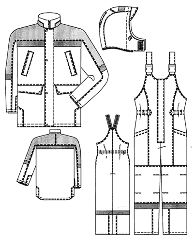 Кокетки полочек и спинки выполнены из ткани отделочного цвета. Под кокетками полочек и спинки, рукавам куртки и по передним и задним половинкам полукомбинезона под наколенником расположена световозвращающая лента шириной 5см.