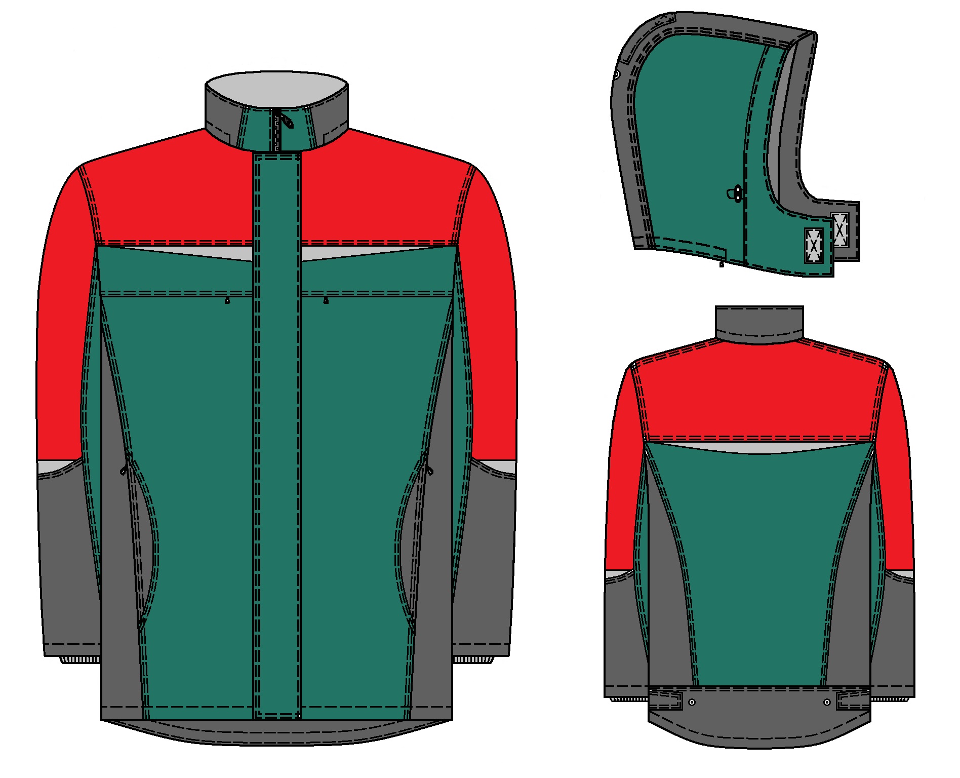 Полочки с нагрудными прорезными карманами с молнией, сбоковыми карманамис молнией в рельефных швах. На левой полочке под ветрозащитным клапаном расположен прорезной карман для документов с молнией.