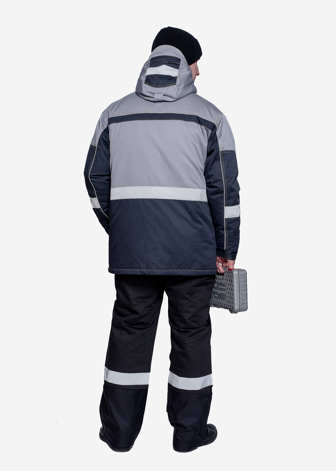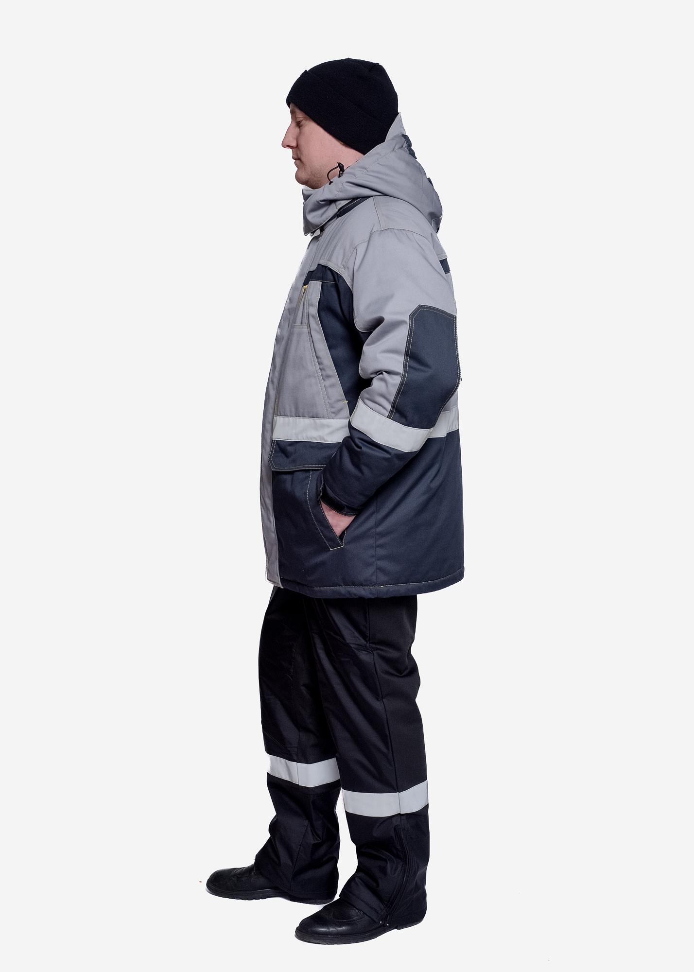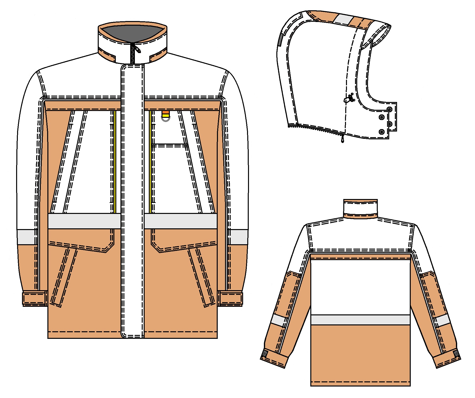 Утепленный капюшон с козырьком пристегивается к куртке на молнию, застегивается на кнопки, регулируется по лицевому вырезу эластичным шнуром с фиксаторами, сзади – патой на контактной ленте.