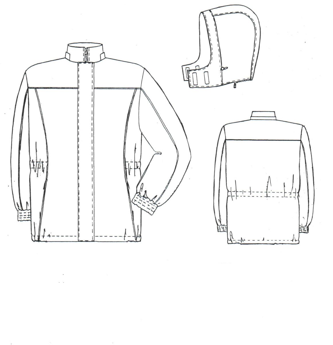 - Капюшон пристегивается к куртке при помощи «молнии», стягивается по лицевому вырезу эластичным шнуром.
