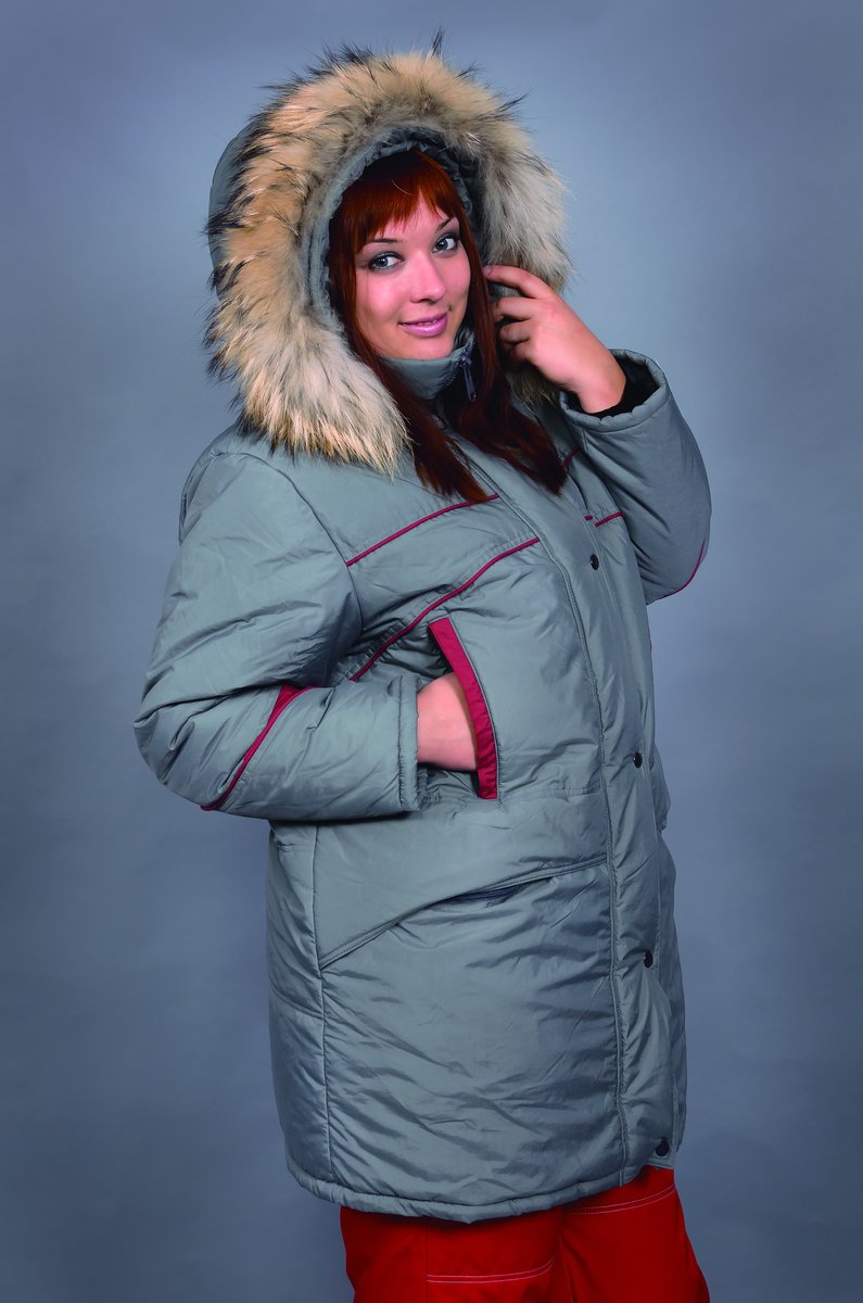 Куртка женская с центральной бортовой застежкой-молнией, с ветрозащитным клапаном, застегивающимся на 5 кнопок, с пристегивающимся капюшоном. Полочки из четыре.к частей, с нагрудными прорезными карманами с листочкой и застежкой-молнией, с боковыми прорезными карманами в рамку с застежкой молнией и фигурными клапанами. Спинка с кокеткой. Рукава втачные, одношовные, с косыми локтевыми и передними частями. Воротник - стойка. Капюшон состоит из средней, боковых частей и стойки и пристегивается к курл ке при помощи застежки-молнии. Лицевой вырез стягивается эластичным шнуром с фиксаторами. По краю обтачки пристегивается меховая опушка на застежку-молнию. По линии притачивания кокеток полочек и спинки, вставок полочки, по линиям притачивания локтевых частей рукава расположен отделочный кант. Верх куртки простеган горизонтально с одним слоем утеплителя, подклад скреплен со вторым слоем. Полочки подкладки с нагрудными карманами и карманом для мобильного телефона. Для peгулирования ширины изделия на уровне линии талии на подкладе сделана кулиска со шнуром и фиксатором.