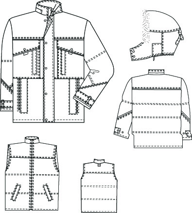 Пристегивающийся жилет может использоваться как самостоятельное изделие. Жилет прямого покроя с центральной застежкой-молнией, с боковыми прорезными карманами с листочками. Воротник - стойка. Полочки подкладки с нагрудными карманами и карманом для мобильного телефона. Жилет пристегивается к куртке при помощи застежки-молнии.