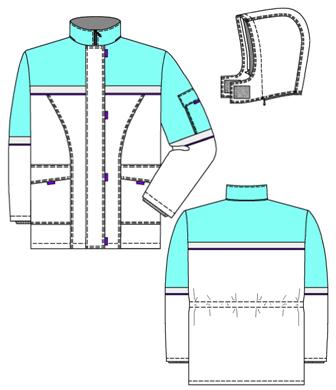 Куртка женская с центральной бортовой застежкой-молнией, с ветрозащитным клапаном, застегивающимся на контактную ленту, с пристегивающимся капюшоном. Полочки с кокетками, рельефными швами, боковыми накладными карманами с клапанами, застегивающимися на контактную ленту. На подкладке левой полочки внутренние карманы для блокнота и мобильного телефона. Спинка с кокеткой, с кулиской по линии талии. Рукава втачные из двух частей, низ рукава с внутренним напульсником. На верхней части левого рукава накладной карман-«полукнижка» с клапаном, застегивающимся на контактную ленту. Воротник-стойка, внутренний воротник из флиса. Капюшон с застежкой на контактную ленту, стягивается по лицевому вырезу эластичным шнуром, регулируемым фиксаторами. Капюшон пристегивается к куртке при помощи тесьмы-молнии. Кокетки полочек и спинки, воротник, верхние части рукавов, карман и клапан кармана рукава - из отделочной ткани. По швам притачивания кокеток и соединения частей рукава прокладывается световозвращающая лента и кант из отделочной ткани. По местам расположения контактной ленты располагаются паты из отделочной ткани.