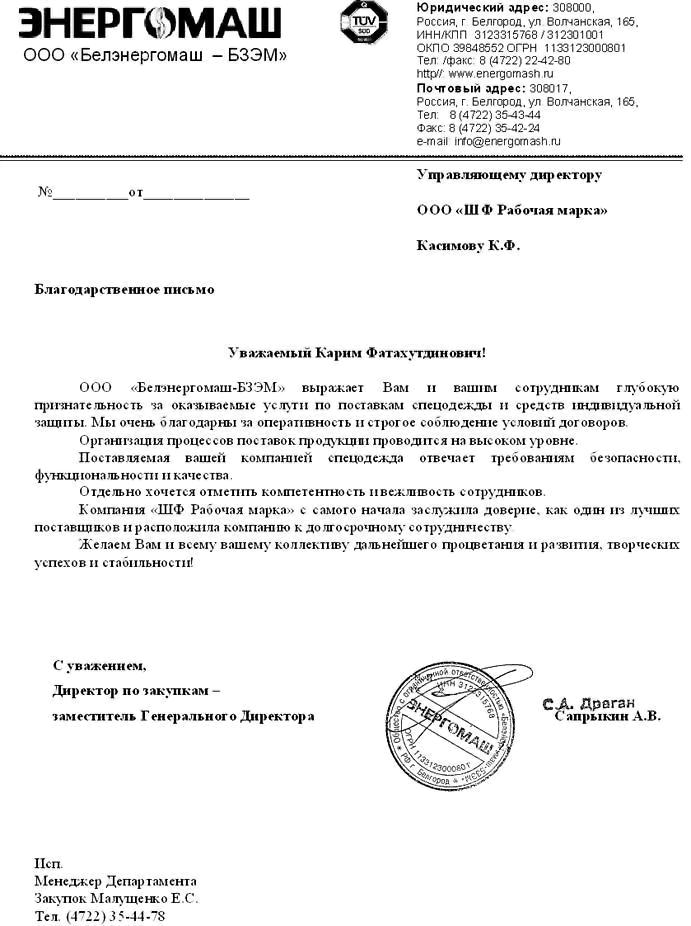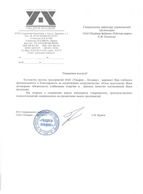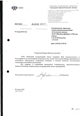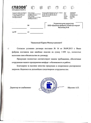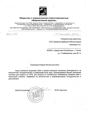 ООО Швейная фабрика «Рабочая марка» сотрудничает с предприятиями разных отраслей промышленности, поэтому вся продукция разрабатывается с учетом условий труда на предприятии заказчика. Спецодежда нашей фабрики проходит обязательную проверку на соответствие требованиям ТР ТС 019/2011 в аккредитованных сертификационных центрах. Именно поэтому наши клиенты всегда получают продукцию в полном соответствии с заданными характеристиками. Многолетний опыт работы и ответственное отношение сотрудников к своему делу, позволяют ООО Швейная фабрика «Рабочая марка» изготовить, а нашим клиентам приобрести качественную спецодежду для любых условий труда.